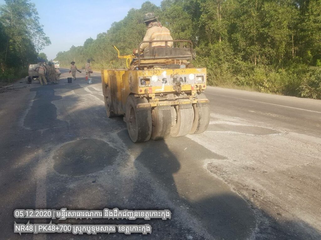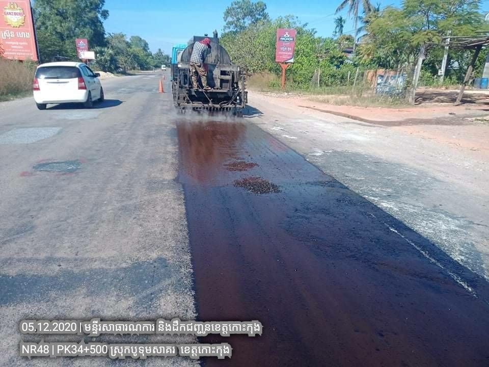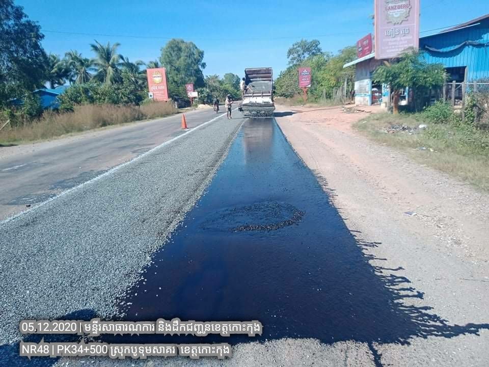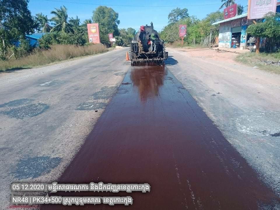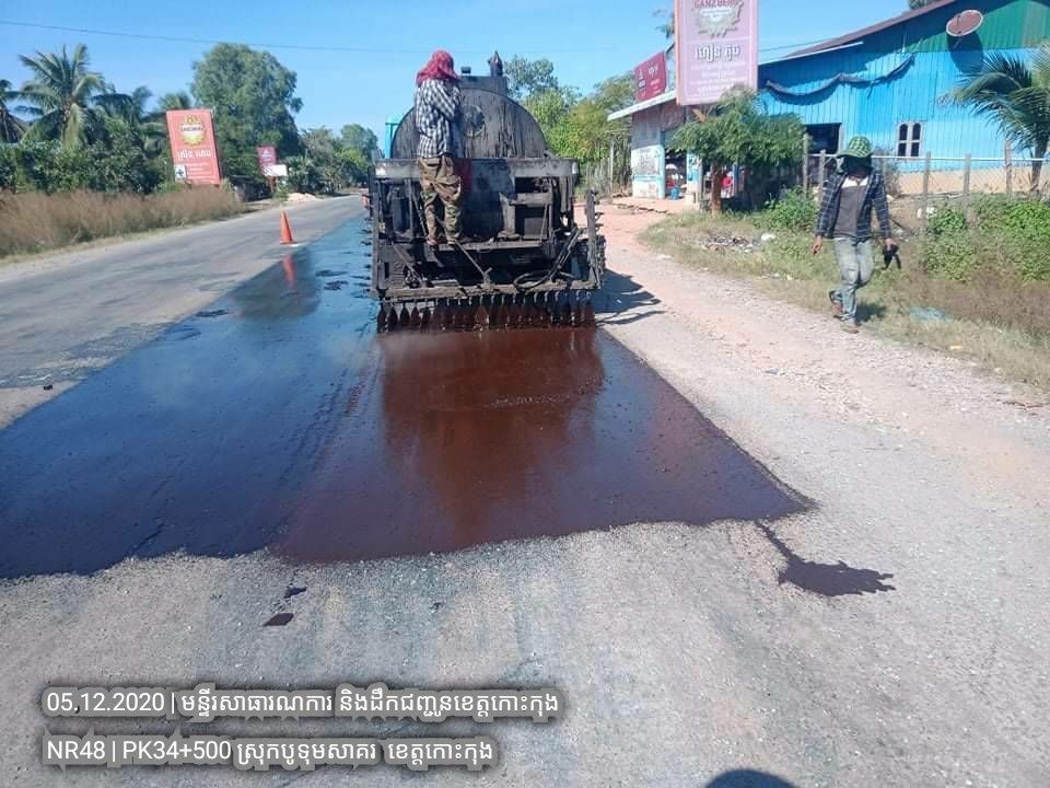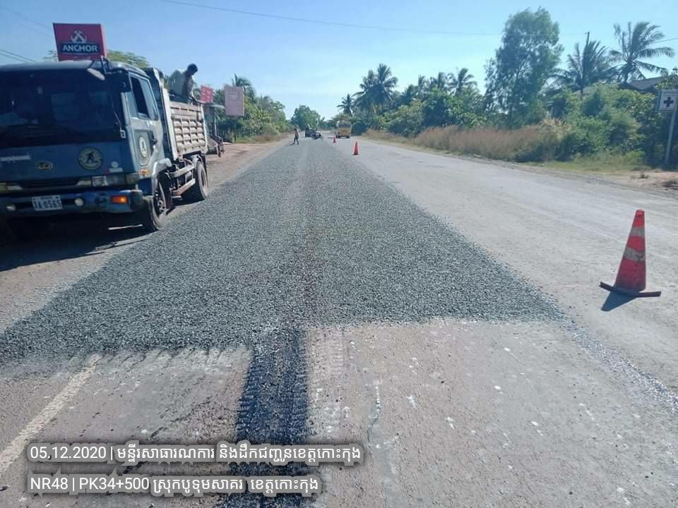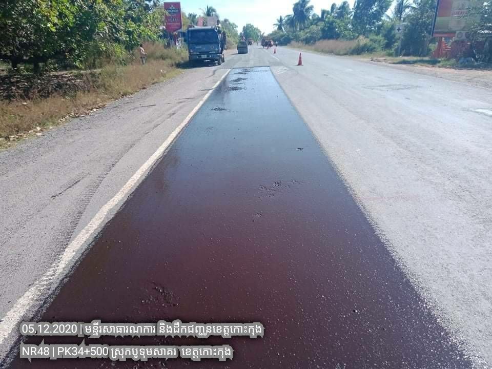 ១. បន្តការងារថែទាំជាប្រចាំលើផ្លូវជាតិលេខ៤៨ សកម្មភាពស្រោចកៅស៊ូ CRS2 រួចរោយថ្ម១២មម លើស្នាមប្រេះស្រកានាគ ត្រង់ចន្លោះគ.ម ៣៤+៥០០