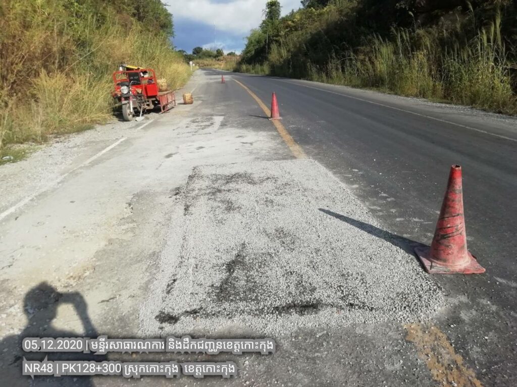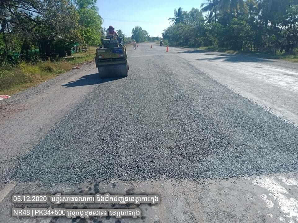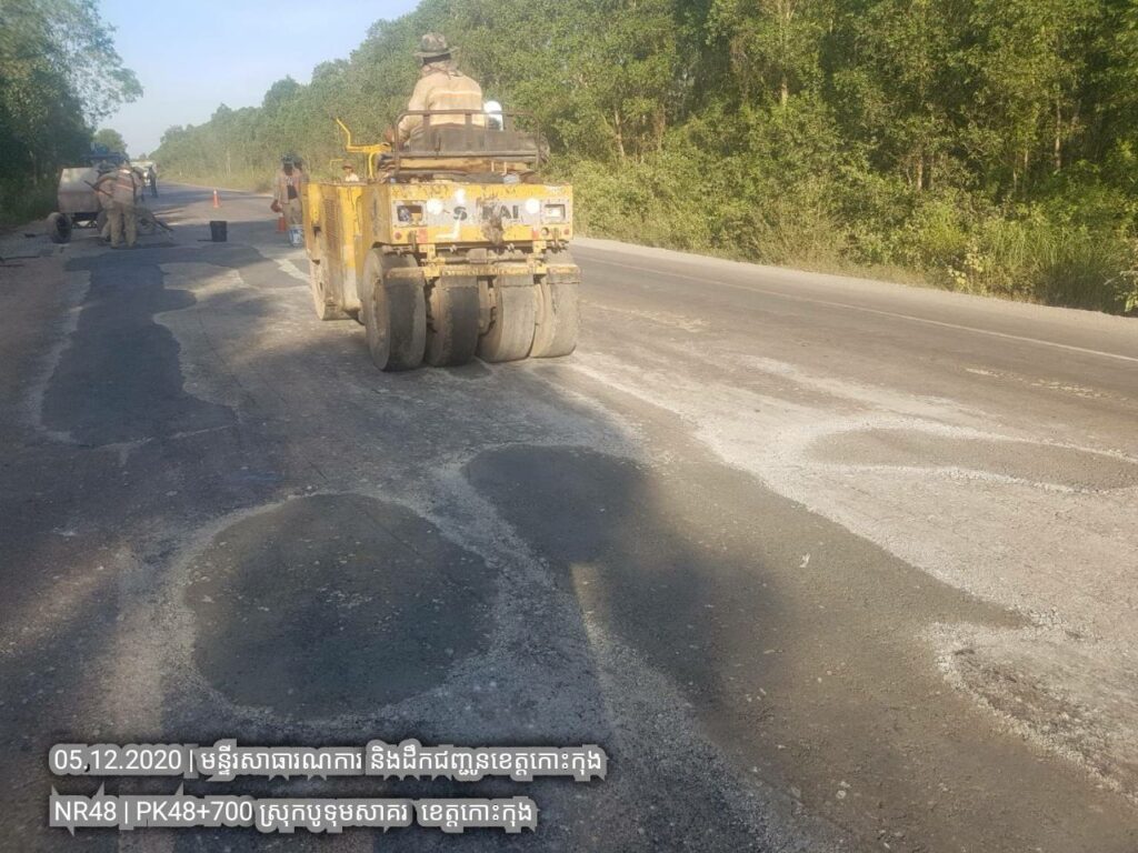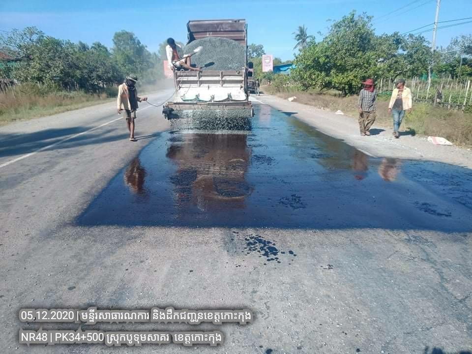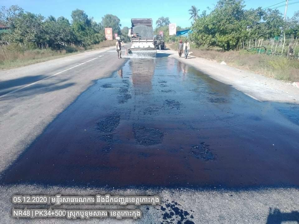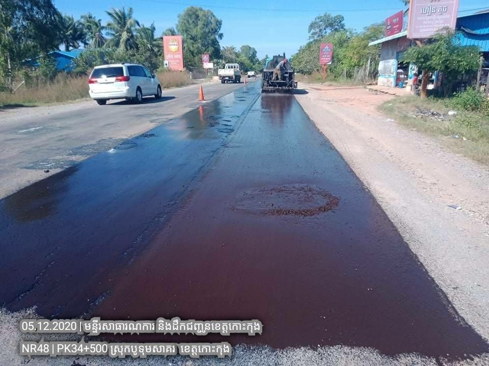 ១. បន្តការងារថែទាំជាប្រចាំលើផ្លូវជាតិលេខ៤៨ សកម្មភាពស្រោចកៅស៊ូ CRS2 រួចរោយថ្ម១២មម លើស្នាមប្រេះស្រកានាគ ត្រង់ចន្លោះគ.ម ៣៤+៥០០