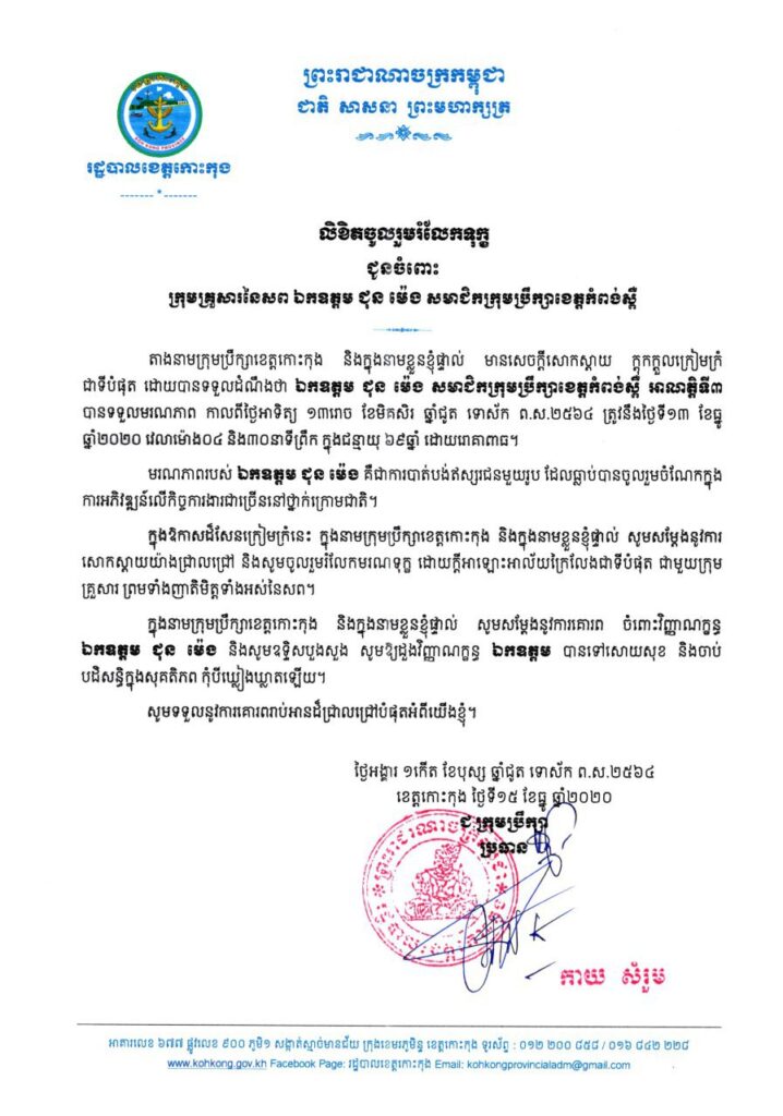 ក្រុមប្រឹក្សាខេត្តកោះកុង សូមចូលរួមរំលែកទុក្ខជាមួយក្រុមគ្រួសារនៃសព ឯកឧត្ដម ជុន ម៉េង សមាជិកក្រុមប្រឹក្សាខេត្តកំពង់ស្ពឺ