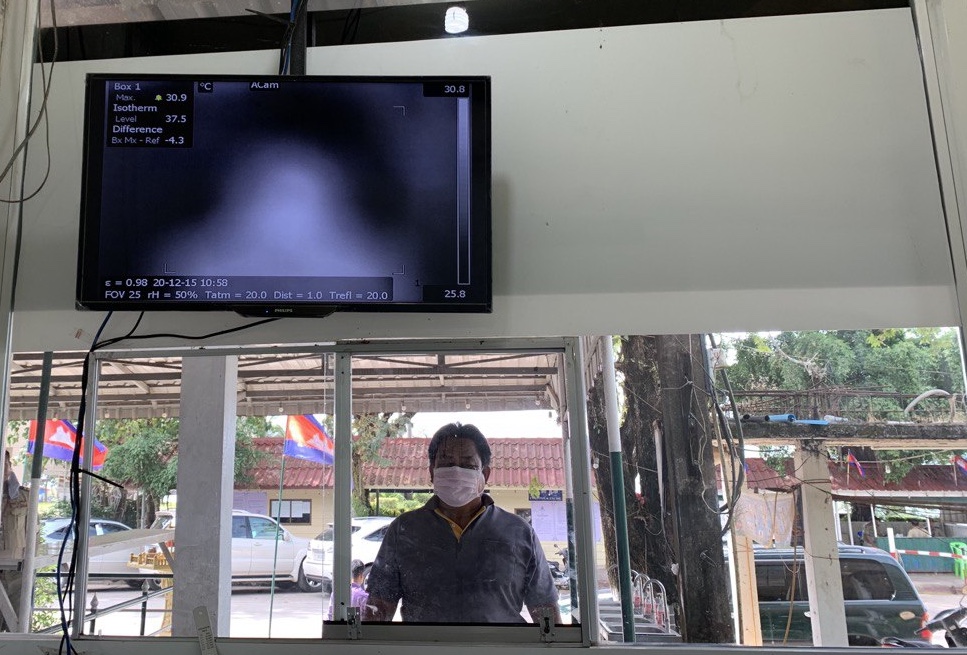 ក្រុមការងារចត្តាឡីស័កនៃមន្ទីរសុខាភិបាលខេត្តកោះកុង បានធ្វើការត្រួតពិនិត្យកំដៅជូនអ្នកបើកបររថយន្តដឹកទំនិញ ចេញ-ចូលតាមច្រកព្រំដែនអន្តរជាតិចាំយាមព្រមជាមួយនឹងការបាញ់ថ្នាំសំលាប់មេរោគទៅលើរថយន្តផងដែរ។