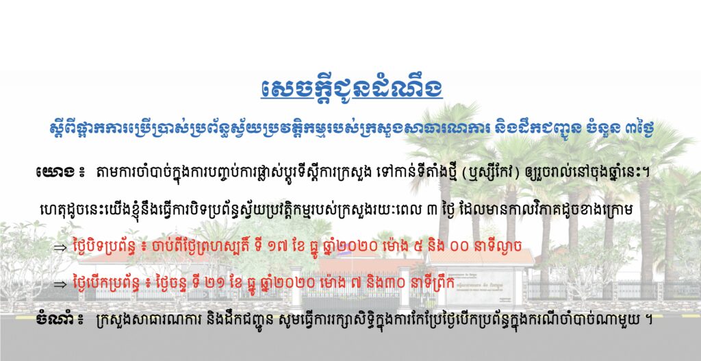 ហេតុដូចនេះ យើងខ្ញុំនឹងធ្វើការបិទប្រព័ន្ធស្វ័យប្រវត្តិកម្មរបស់ក្រសួងសាធារណការ និងដឹកជញ្ជូន រយៈពេល ៣ ថ្ងៃដែលមានកាលវិភាគដូចខាងក្រោម