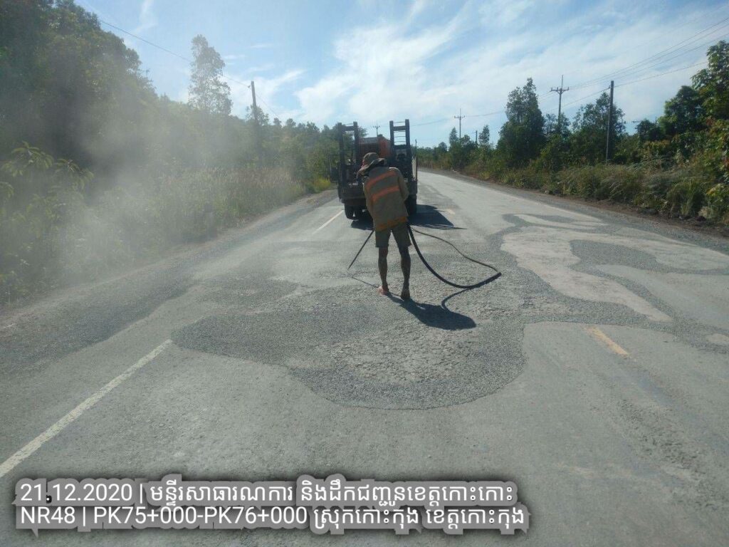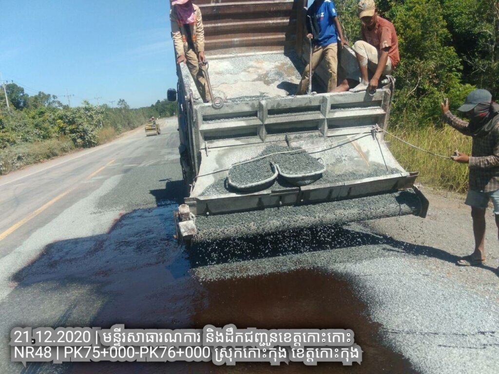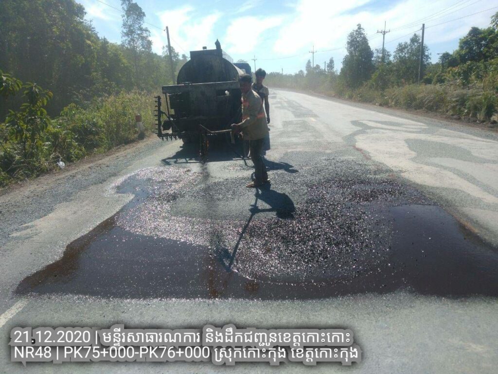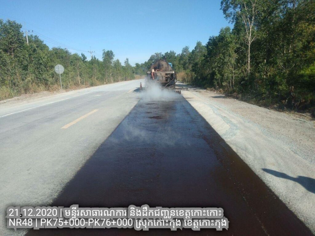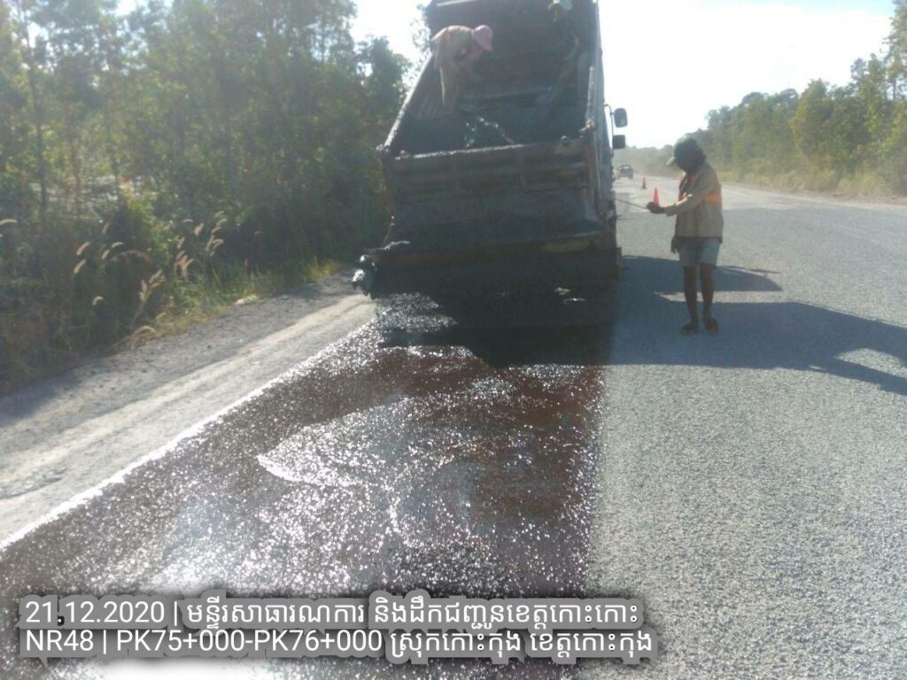 ១. បន្តការងារថែទាំជាប្រចាំលើផ្លូវជាតិលេខ៤៨ សកម្មភាពស្រោចកៅស៊ូ CRS2 រួចបាចថ្ម១២មម ត្រង់ចន្លោះ គ.ម ៧៥+០០០ – គ.ម ៧៦+០០០