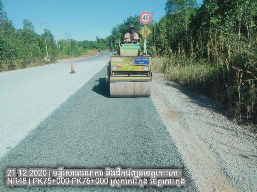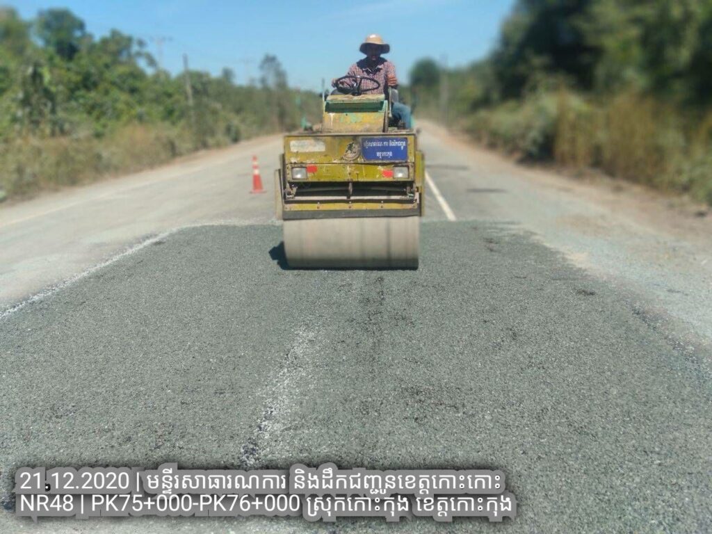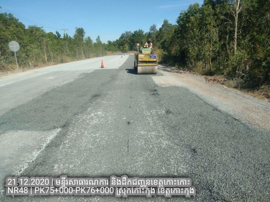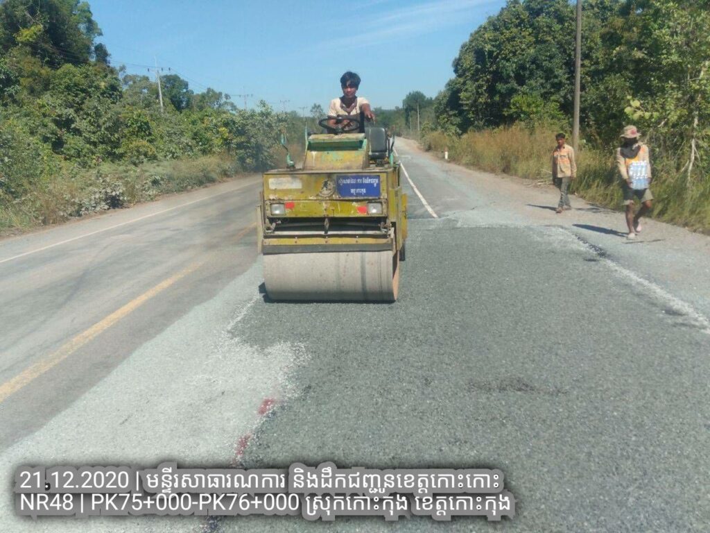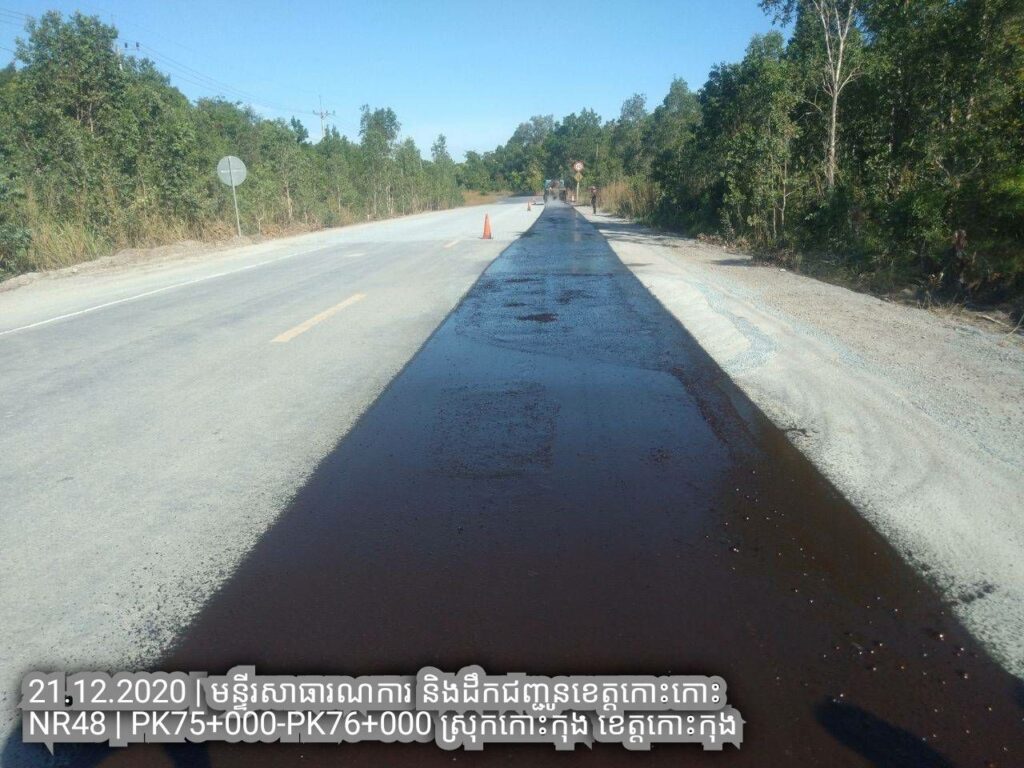 ១. បន្តការងារថែទាំជាប្រចាំលើផ្លូវជាតិលេខ៤៨ សកម្មភាពស្រោចកៅស៊ូ CRS2 រួចបាចថ្ម១២មម ត្រង់ចន្លោះ គ.ម ៧៥+០០០ – គ.ម ៧៦+០០០