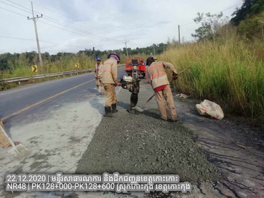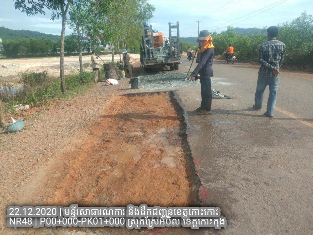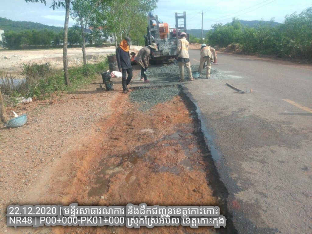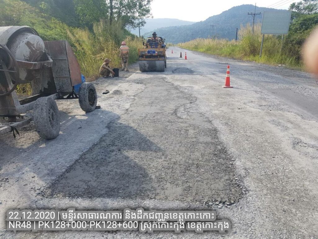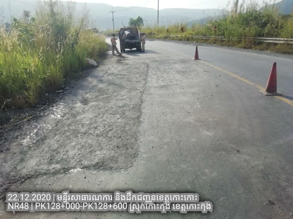 ១.បន្តការងារថែទាំជាប្រចាំលើផ្លូវជាតិលេខ៤៨ សកម្មភាពជួសជុលសំបុកមាន់ដោយប្រើល្បាយថ្មម៉ិចលាយជាមួយស៊ីម៉ង់ត៏និងកៅស៊ូ CRS2 ត្រង់ គ.ម ១២៨+០០០ – គ.ម ១២៨+៦០០