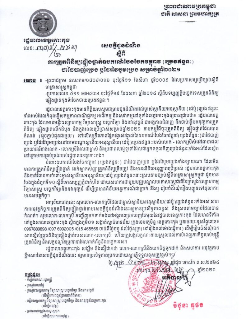 សេចក្តីជូនដំណឹងរបស់រដ្ឋបាលខេត្តកោះកុង ស្តីពីការត្រួតពិនិត្យផ្ទៀងផ្ទាត់ឧបករណ៍បែងចែកវត្ថុរាវ (ប្រេងឥន្ធនៈ) ជាដៃបាញ់ប្រេង ឬដៃរវៃបូមប្រេង សម្រាប់ឆ្នាំ២០២១