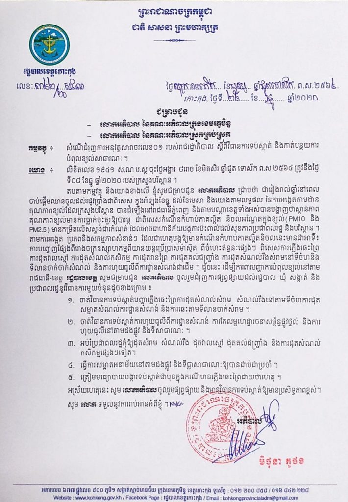 សំណើជំរុញការអនុវត្តសារាចរលេខ០១ របស់រាជរដ្ឋាភិបាល ស្តីពីវិធានការទប់ស្កាត់ និងកាត់បន្ថយការ បំពុលខ្យល់សាធារណៈ ។