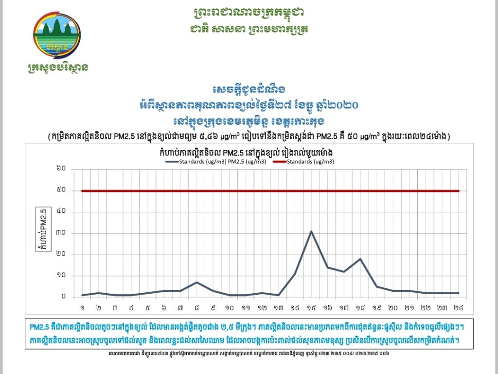 សេចក្តីជូនដំណឹងរបស់មន្ទីរបរិស្ថានខេត្តកោះកុង ស្តីពីគុណភាពខ្យល់នៅក្នុងក្រុងខេមរភូមិន្ទ ថ្ងៃទី២៧ ខែធ្នូ ឆ្នាំ២០២០