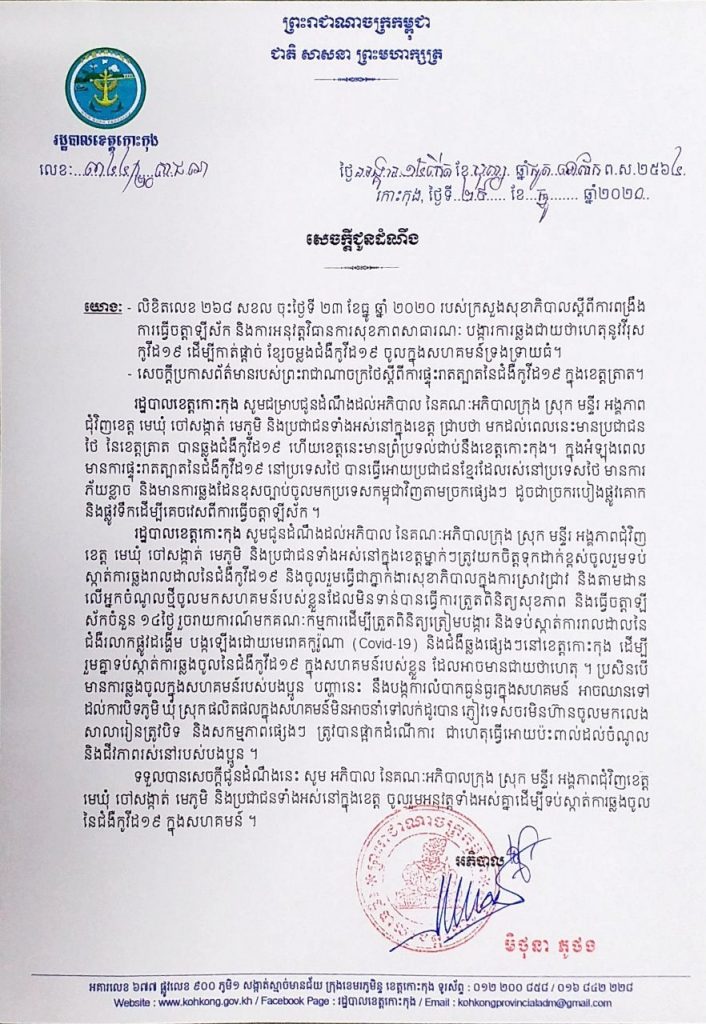 សេចក្តីជូនដំណឹង របស់រដ្ឋបាលខេត្ដកោះកុង