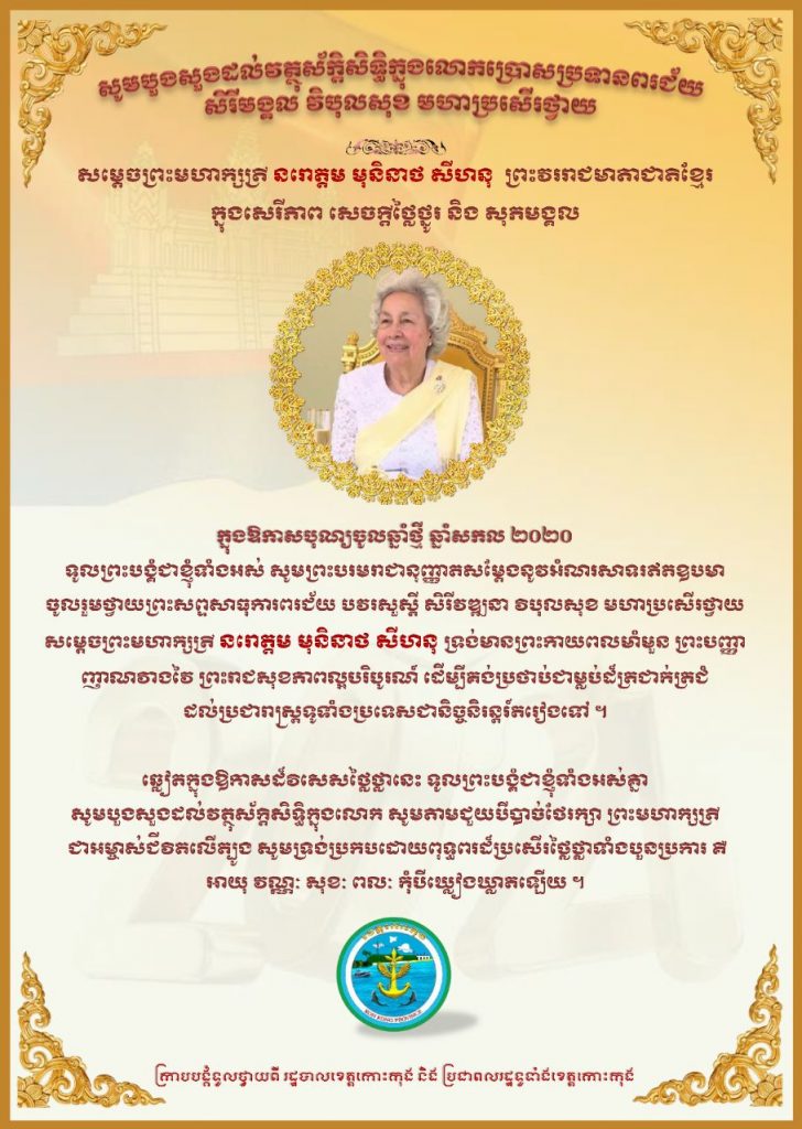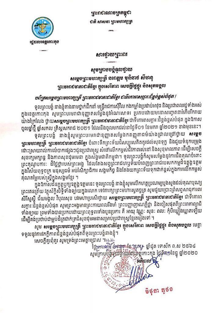 លោកជំទាវ មិថុនា ភូថង អភិបាល នៃគណៈអភិបាលខេត្តកោះកុង សូមក្រាបបង្គំទូលថ្វាយព្រះពរ សម្តេចព្រះមហាក្សត្រី នរោត្តម មុនិនាថ សីហនុ ព្រះវររាជមាតាជាតិខ្មែរ ក្នុងសេរីភាព សេចក្តីថ្លៃថ្នូរ និងសុភមង្គល ក្នុងឱកាសបុណ្យចូលឆ្នាំថ្មី ឆ្នាំសកល ២០២១