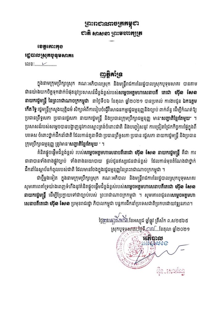 ក្នុងនាមក្រុមប្រឹក្សាស្រុក គណៈអភិបាលស្រុក មន្រ្តីរាជការនៃរដ្ឋបាលស្រុកបូទុមសាគរ បានតាមដានយ៉ាងយកចិត្តទុកដាក់បំផុតនូវប្រសាសន៍ដ៏ខ្ពង់ខ្ពស់របស់ សម្ដេចអគ្គមហាសេនាបតី តេជោ ហ៊ុន សែន នាយករដ្ឋមន្រ្តី នៃព្រះរាជាណាចក្រកម្ពុជា ។