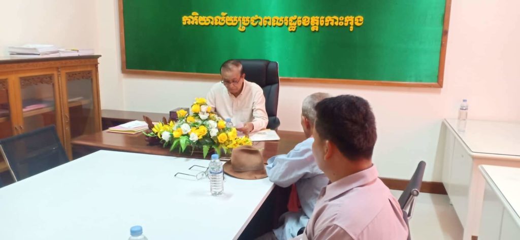 លោក សោម សុធីរ ប្រធានការិយាល័យប្រជាពលរដ្ឋ ខេត្តកោះកុង បានទទួលជួប និងទទួលព័ត៌មានពីប្រជាពលរដ្ឋ អំពីដី មួយកន្លែង ស្ថិតក្នុងសង្កាត់ស្ទឹងវែង ក្រុងខេមរភូមិន្ទ ដែលមានប្រជាពលរដ្ឋ ចំនួន ០៩ គ្រួសារ មានផ្ទៃដី ១០ ហិកតា ដែលមានទំនាស់ ប្រជាពលរដ្ឋ ស្នើសូមជួយអន្តរាគមន៍ ក្នុងការដោះស្រាយ។
