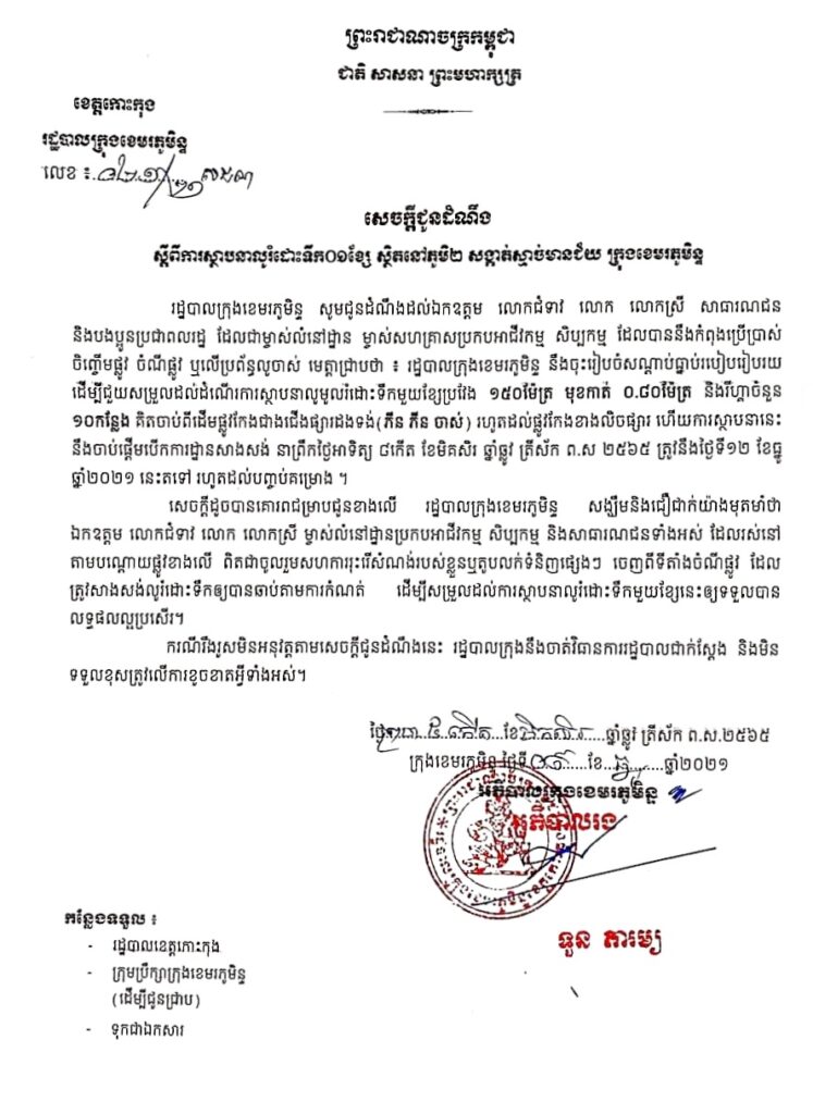 សេចក្តីជូនដំណឹង ស្តីពីការស្ថាបនាលូរំដោះទឹក ០១ខ្សែ ស្ថិតនៅភូមិ២ សង្កាត់ស្មាច់មានជ័យ ក្រុងខេមរភូមិន្ទ