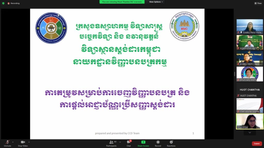 ថ្នាក់ដឹកនាំ និងមន្រ្តីជំនាញនៃមន្ទីរឧស្សាហកម្ម វិទ្យាសាស្រ្ត បច្ចេកវិទ្យា និងនវានុវត្តន៍ខេត្តកោះកុង ចូលរួមវគ្គបណ្តុះបណ្តាលស្តីពីការតម្រូវសម្រាប់ការចេញវិញ្ញាបនបត្រ និងការផ្តល់អាជ្ញាប័ណ្ណប្រើសញ្ញាស្តង់ដារ ដែលបានរៀបចំដោយ វិទ្យាស្ថានស្តង់ដារកម្ពុជា។