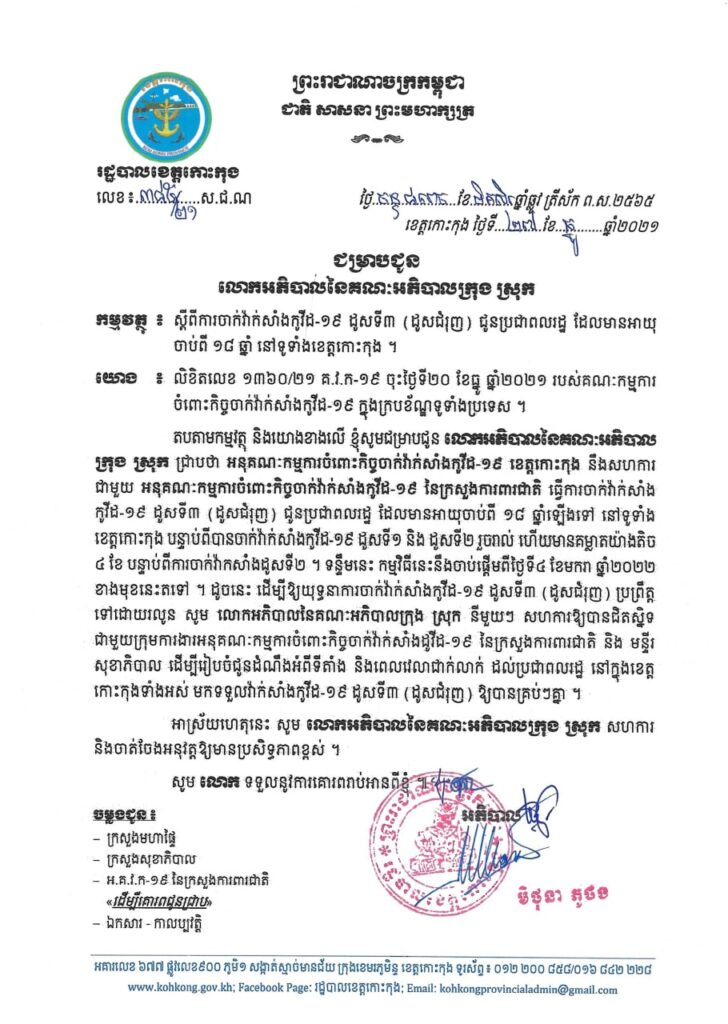 សេចក្តីជូនដំណឹង ស្តីពីការចាក់វ៉ាក់សាំងកូវីដ-១៩ ដូសទី៣ (ដូសជំរុញ) ជូនប្រជាពលរដ្ឋ ដែលមានអាយុ ចាប់ពី ១៨ ឆ្នាំ នៅទូទាំងខេត្តកោះកុង។
