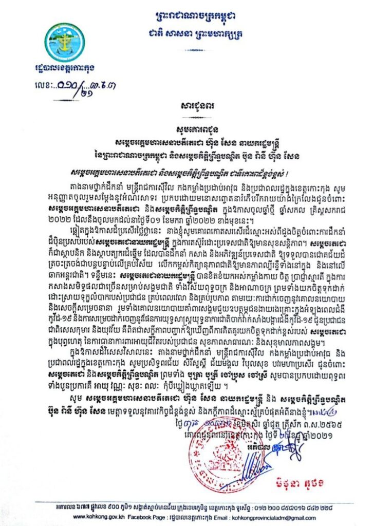តាងនាមថ្នាក់ដឹកនាំ មន្ត្រីរាជការស៊ីវិល កងកម្លាំងប្រដាប់អាវុធ និងប្រជាពលរដ្ឋក្នុងខេត្តកោះកុង សូម អនុញ្ញាតចូលរួមសម្ដែងនូវអំណ៍រសាទរ ប្រកបដោយមនោសញ្ចេតនារំភើបរីករាយយ៉ាងក្រៃលែងជូនចំពោះ សម្តេចអគ្គមហាសេនាបតីតេជោ និងសម្តេចកិត្តិព្រឹទ្ធបណ្ឌិត ក្នុងឱកាសចូលឆ្នាំថ្មី ឆ្នាំសកល គ្រិស្តសករាជ ២០២២ ដែលនឹងចូលមកដល់នាថ្ងៃទី០១ ខែមករា ឆ្នាំ២០២២ ខាងមុខនេះ