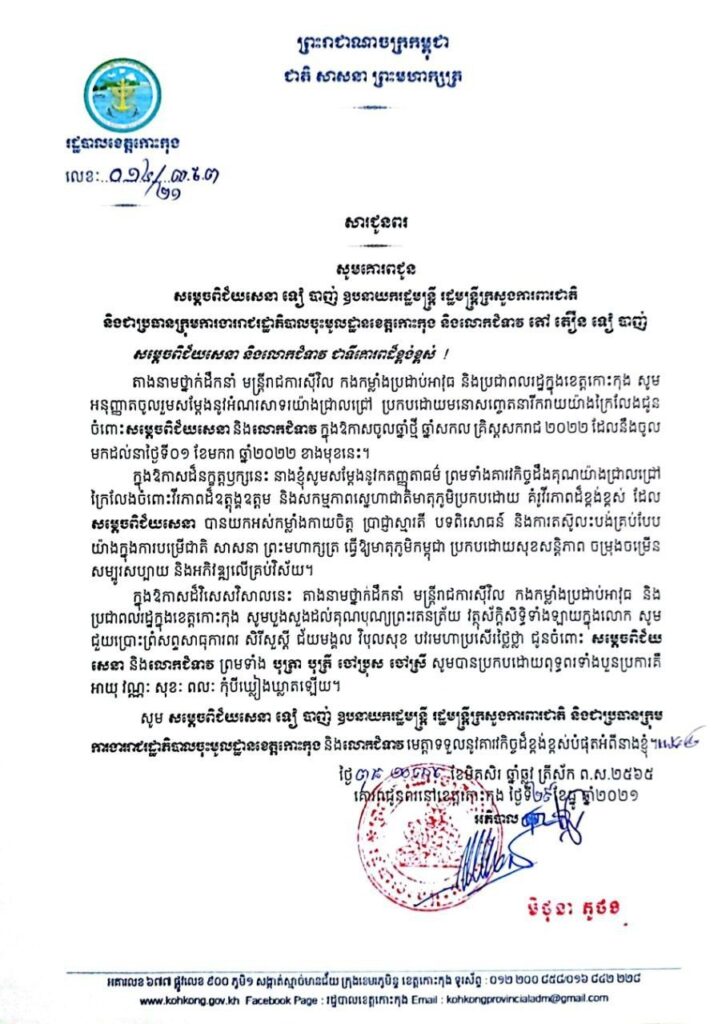 តាងនាមថ្នាក់ដឹកនាំ មន្ត្រីរាជការស៊ីវិល កងកម្លាំងប្រដាប់អាវុធ និងប្រជាពលរដ្ឋក្នុងខេត្តកោះកុង សូម អនុញ្ញាតចូលរួមសម្ដែងនូវអំណរសាទរយ៉ាងជ្រាលជ្រៅ ប្រកបដោយមនោសញ្ចេតនារីករាយយ៉ាងក្រៃលែងជូន ចំពោះសម្តេចពិជ័យសេនា និងលោកជំទាវ ក្នុងឱកាសចូលឆ្នាំថ្មី ឆ្នាំសកល គ្រិស្តសករាជ ២០២២ ដែលនឹងចូល មកដល់នាថ្ងៃទី០១ ខែមករា ឆ្នាំ២០២២ ខាងមុខនេះ
