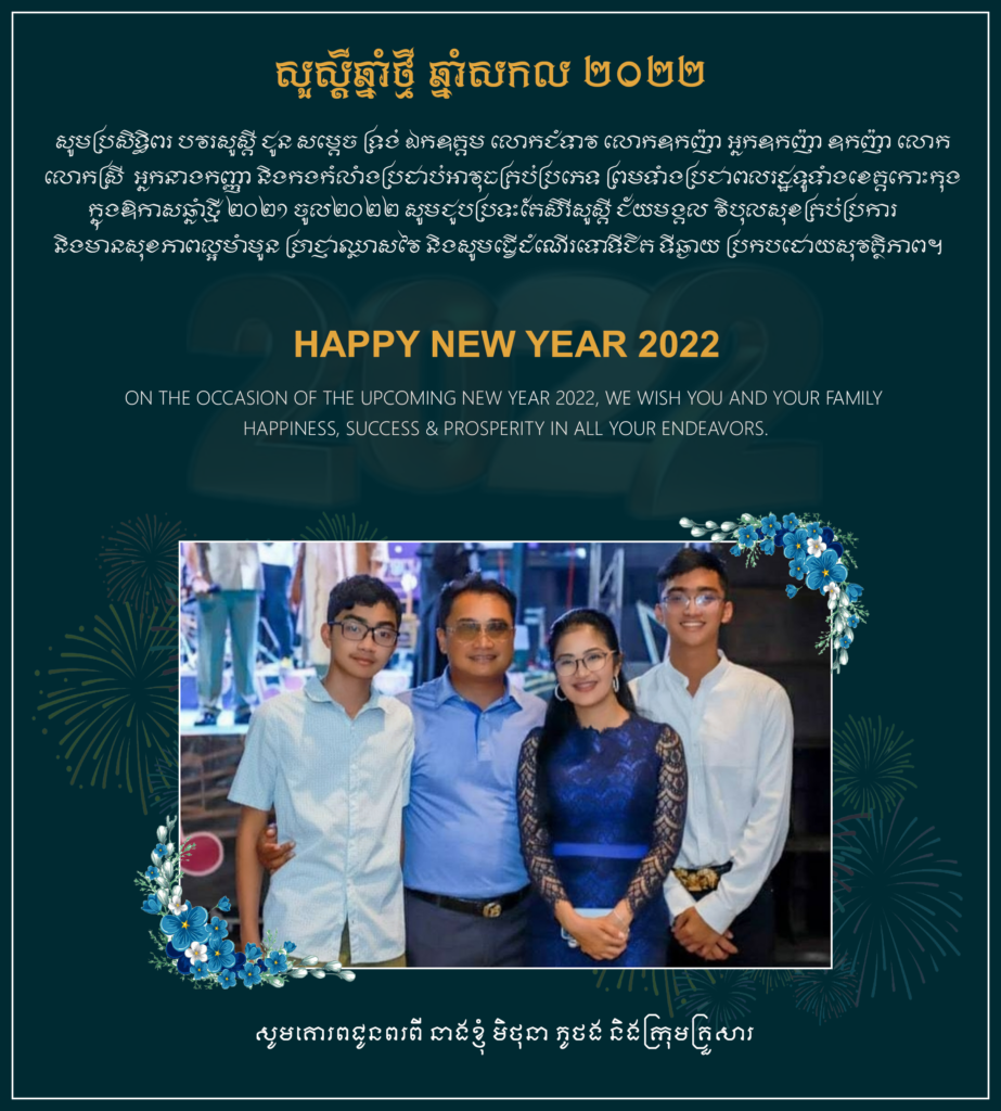 សូមប្រសិទ្ធិពរ បវរសួស្តី ជូន សម្តេច ទ្រង់ ឯកឧត្តម លោកជំទាវ លោកឧកញ៉ា អ្នកឧកញ៉ា ឧកញ៉ា លោក លោកស្រី អ្នកនាងកញ្ញា និងកងកំលាំងប្រដាប់អាវុធគ្រប់ប្រភេទ ព្រមទាំងប្រជាពលរដ្ឋទូទាំងខេត្តកោះកុង ក្នុងឱកាសឆ្នាំថ្មី ឆ្នាំ២០២១ ចូល២០២២ សូមជួបប្រទះតែ សេរីសួស្តី ជ័យមង្គល វិបុលសុខគ្រប់ប្រការ និងមានសុខភាពល្អមាំមួន ប្រាជ្ញាឈ្លាសវៃ និងសូមធ្វើដំណើរទៅទីជិត ទីឆ្ងាយ ប្រកបដោយសុវត្ថិភាព។