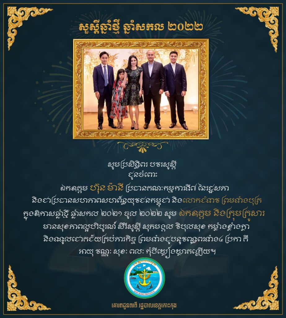 សូមប្រសិទ្ធិពរ បវរសួស្តី ជូនចំពោះ ឯកឧត្តម ហ៊ុន ម៉ានី ប្រធានគណៈកម្មការទី៧ នៃរដ្ឋសភា និងជាប្រធានសហភាពសហព័ន្ធយុវជនកម្ពុជា និងលោកជំទាវ ព្រមទាំងបុត្រ ក្នុងឱកាសឆ្នំាថ្មី ឆ្នាំសកល ២០២១ ចូល ២០២២ សូម ឯកឧត្តម និងក្រុមគ្រួសារ មានសុខភាពល្អបរិបូរណ៍ សិរីសួស្តី សុភមង្គល វិបុលសុខ កម្លាំងខ្លាំងក្លា និងទទួលជោគជ័យគ្រប់ភារកិច្ច ព្រមទាំងជួបនូវពុទ្ធពរទាំង៤ ប្រកា គឺ អាយុ វណ្ណៈ សុខៈ ពលៈ កុំបីឃ្លៀងឃ្លាតឡើយ។