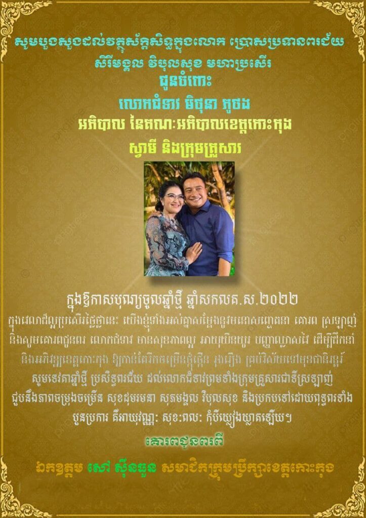 ឯកឧត្តម សៅ ស៊ឹនធួន សមាជិកក្រុមប្រឹក្សាខេត្តកោះកុង គោរពជូនពរ លោកជំទាវ មិថុនា ភូថង អភិបាល នៃគណៈអភិបាលខេត្តកោះកុង និងស្វាមី ក្រុមគ្រួសារ ក្នុងឱកាសបុណ្យចូលឆ្នាំថ្មី ឆ្នាំសកល ២០២១ ចូល ២០២២