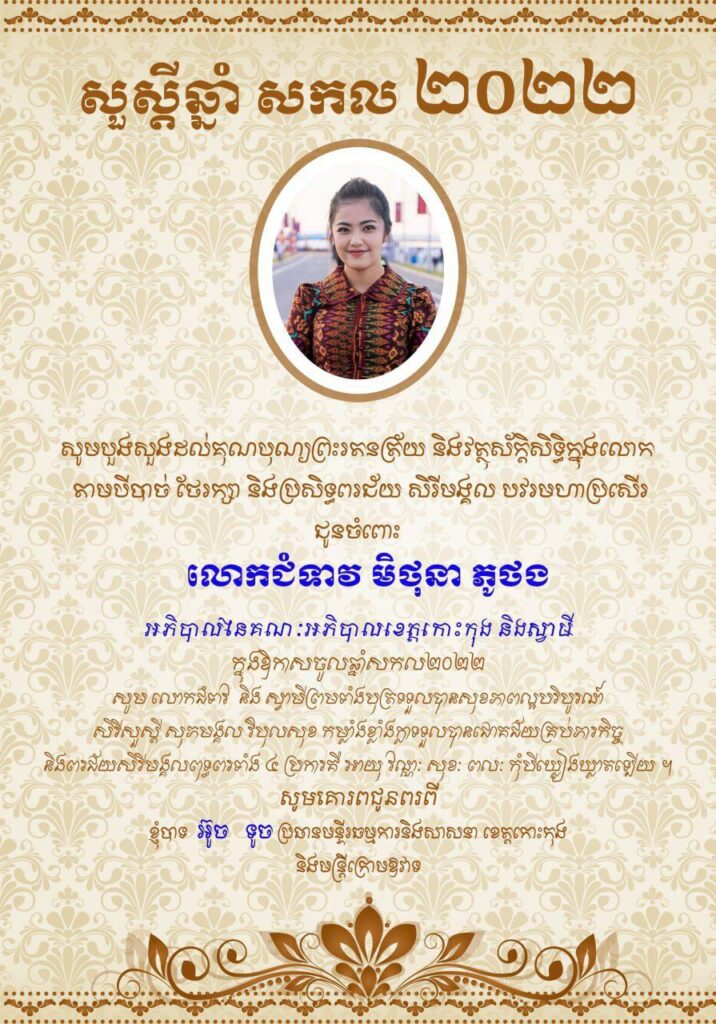 លោក អ៊ូច ទូច ប្រធានមន្ទីរធម្មការ និងសាសនាខេត្តកោះកុង សូមគោរពជូនពរ លោកជំទាវ មិថុនា ភូថង អភិបាល នៃគណៈអភិបាលខេត្តកោះកុង និងស្វាមី ក្នុងឱកាសចូលឆ្នាំថ្មី ឆ្នាំសកល២០២២