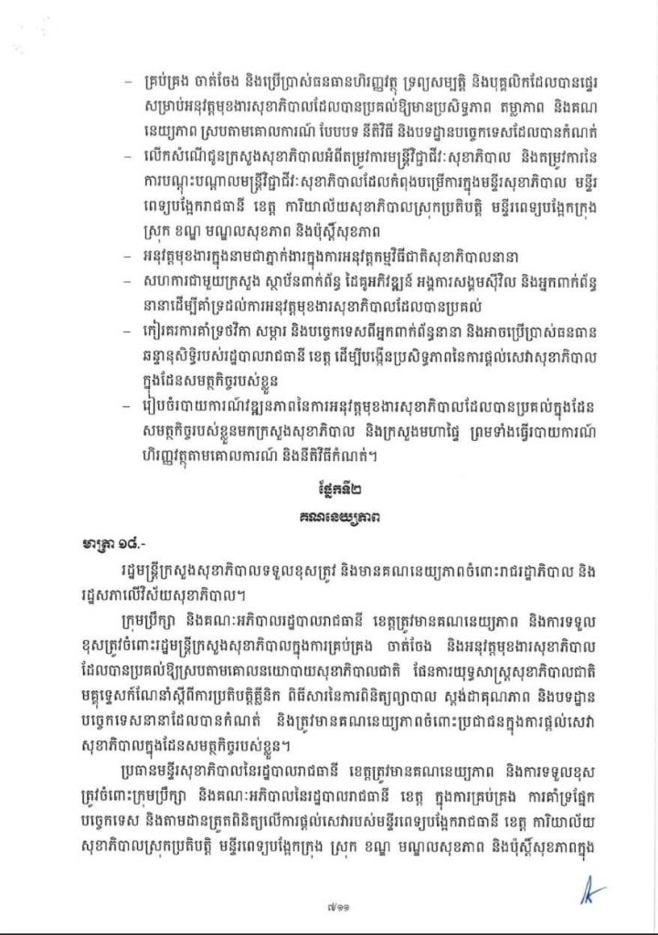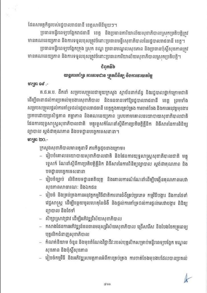 អនុក្រឹត្យ លេខ ១៩៣ អនក្រ.បក ចុះថ្ងៃពុធ ៩ កើត ខែមិគសិរ ឆ្នាំកុរ ឯកស័ក ព.ស.២៥៦៣ ត្រូវនឹងថ្ងៃទី៤ ខែធ្នូ ឆ្នាំ២០១៩ ស្តីពីការគ្រប់គ្រង និងផ្តល់សេវាសុខាភិបាល ទៅអោយរដ្ឋបាលរាជធានី ខេត្ត