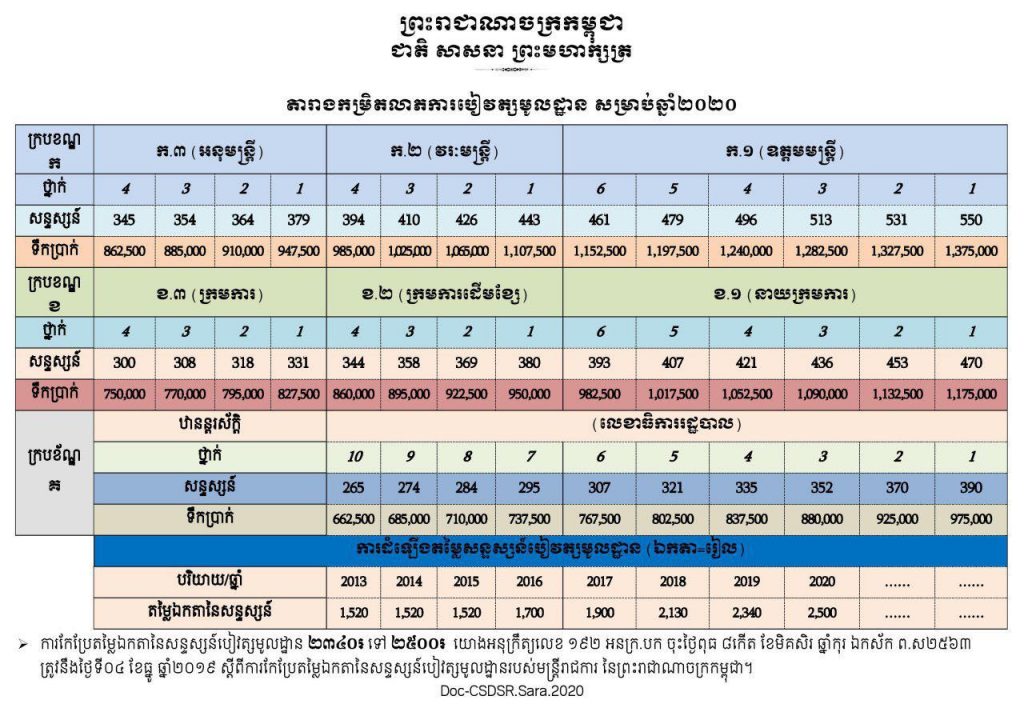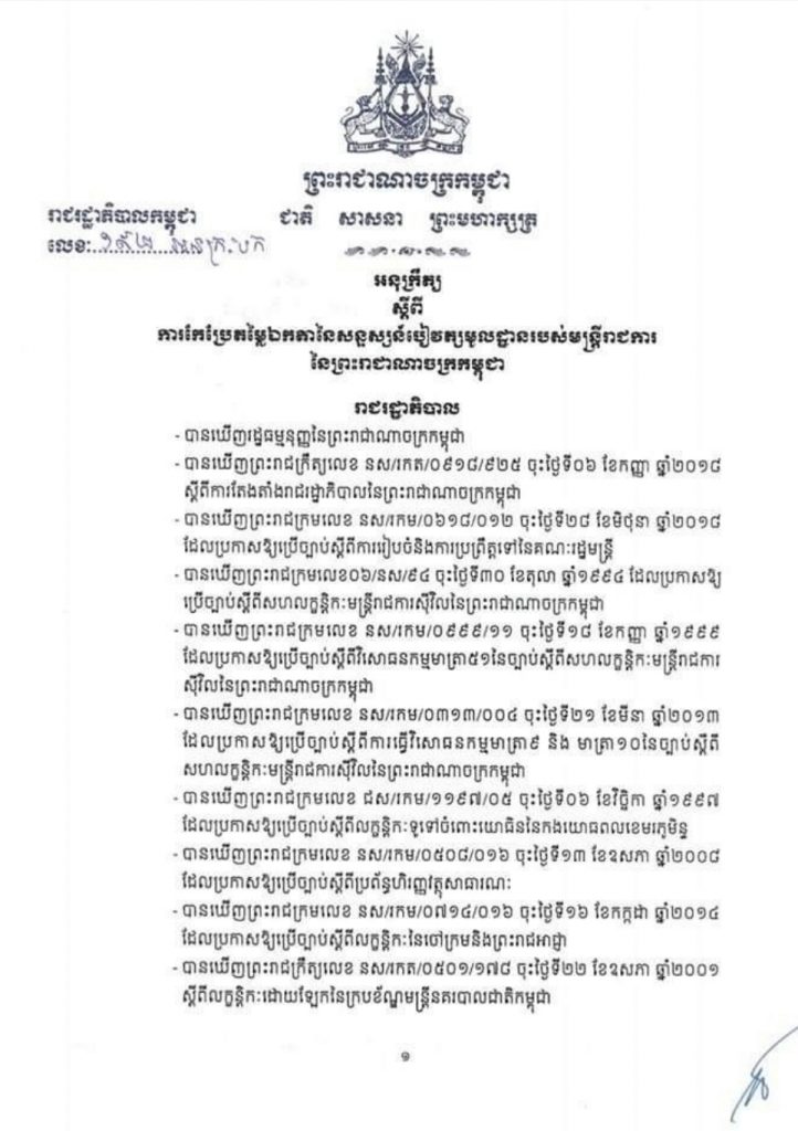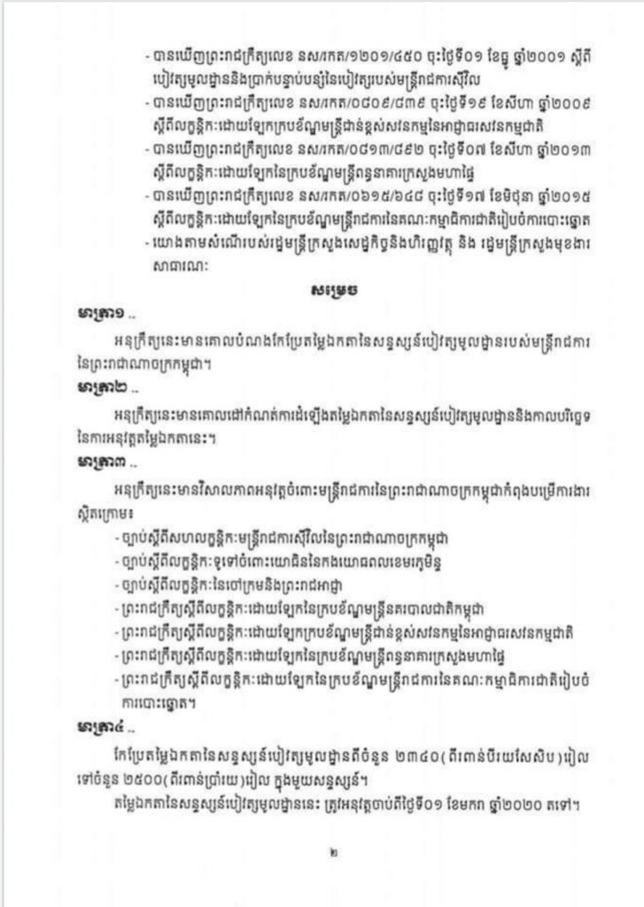 អនុក្រឹត្យ លេខ ១៩២ អនុក្រ.បក ចុះថ្ងៃពុធ ៨ កើត ខែមិគសិរ ឆ្នាំកុរ ឯកស័ក ព.ស. ២៥៦៣ ស្តីពីការប្រែតម្លៃឯកតា នៃសន្ទស្សន៍បៀវត្សមូលដ្ឋានរបស់មន្ត្រីរាជការ នៃព្រះរាជាណាចក្រកម្ពុជា