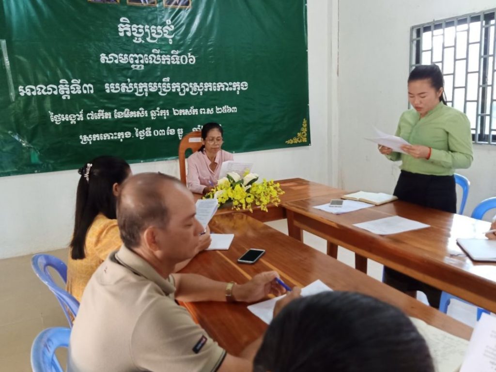 សាលាស្រុកកោះកុង បានបើកកិច្ចប្រជុំប្រចាំខែធ្នូ របស់គណៈកម្មាធិការពិគ្រោះយោបល់កិច្ចការស្រ្ដី និងកុមារ ដែលដឹកនាំ ដោយលោកស្រី សឿ សាវី ប្រធាន គ.ក.ស.ក និងសមាជិក សរុបចំនួន ១៣ នាក់ ស្រីចំនួន ០៦ នាក់។