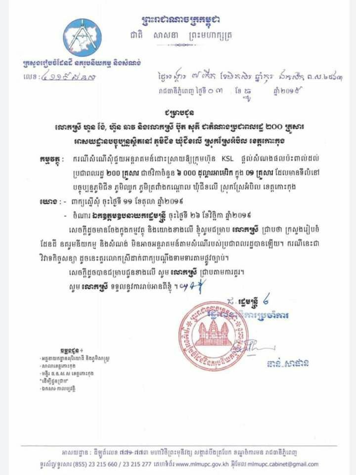 សេចក្តីប្រកាសព័ត៌មាន ករណីសំណើសុំជួយអន្តរាគមន៍ដោះស្រាយឱ្យក្រុមហ៊ុន KSL ផ្តល់សំណងផលប៉ះពាល់ប្រជាពលរដ្ឋ ២០០ គ្រួសារ នៅភូមិជីខលើ ភូមិឈូក ភូមិត្រពាំងកណ្តាល ឃុំជីខលើ ស្រុកស្រែអំបិល ខេត្តកោះកុង។