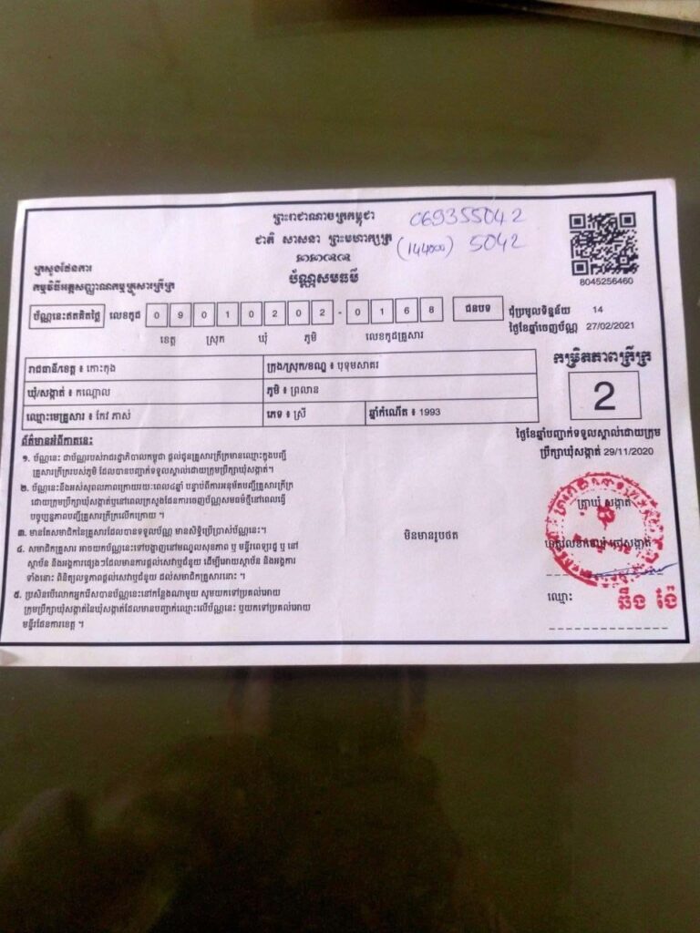 លោកស្រី ង៉ែ ដា មេឃុំស្តីទី ទទួលបន្ទុកស្ត្រី និងកុមារឃុំ បានផ្តល់កាតវិងជូនស្រ្តីមានផ្ទៃពោះចំនួន ០១នាក់ ឈ្មោះ កែវ ភាស់ អាយុ២៩ឆ្នាំ មានទីលំនៅភូមិព្រលាន ឃុំកណ្តោល ស្រុកបូទុមសាគរ ខេត្តកោះកុង។