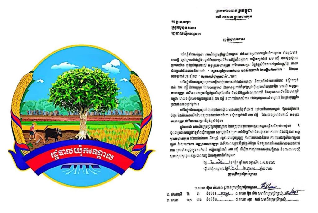 ក្នុងនាមក្រុមប្រឹក្សាឃុំកណ្តោល ដែលជាប់ឆ្នោតអាណត្តិទី៥ យើងខ្ញុំទាំងអស់គ្នា សូមប្រកាសថ្កោលទោសយ៉ាងដាច់អហង្ការ ចំពោះទណ្ឌិតក្បត់ជាតិ សម រង្ស៊ី ដែលបានប្រមាថយ៉ាងធ្ងន់ធ្ងរបំផុតមកលើ ព្រះចេស្តា ព្រះករុណា ព្រះបាទសម្តេច ព្រះបរមនាថ នរោត្ដម សីហមុនី ព្រះមហាក្សត្រ នៃព្រះរាជាណាចក្រកម្ពុជា ជាទីគោរពសក្ការៈដ៏ខ្ពង់ខ្ពស់បំផុត នៃប្រជារាស្ត្រខ្មែរទូទាំងព្រះរាជាណាចក្រកម្ពុជា