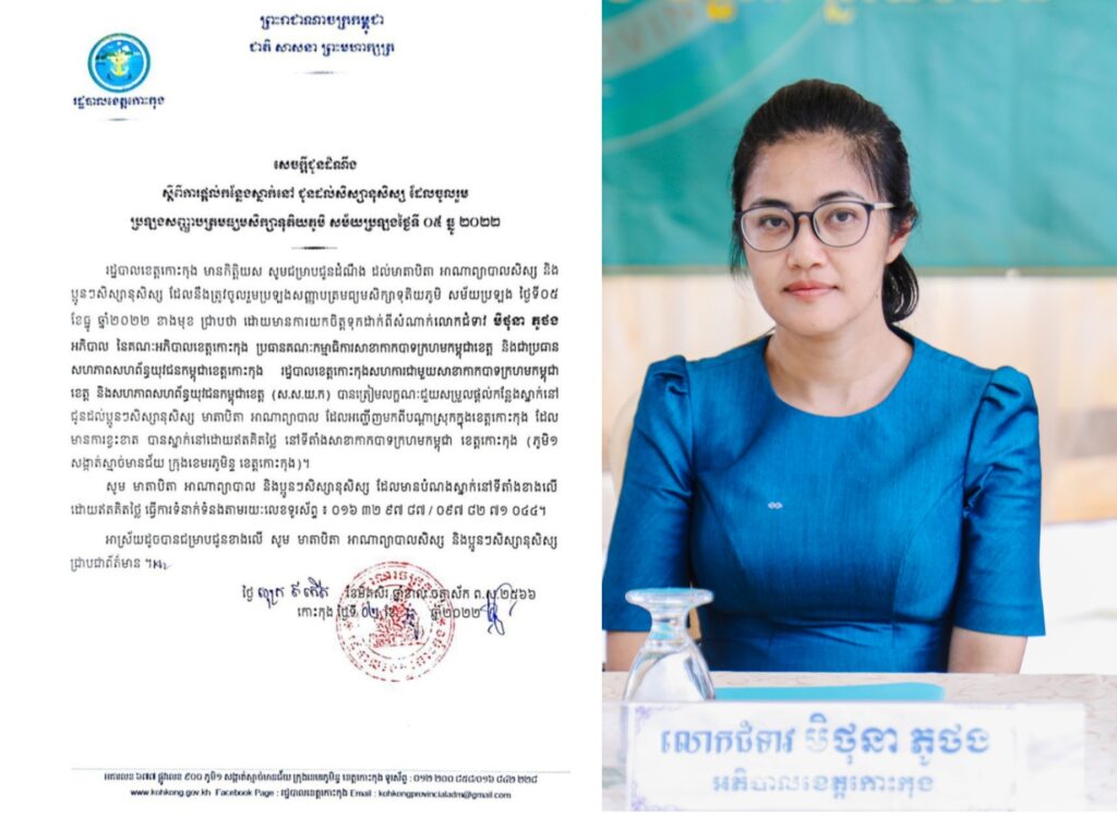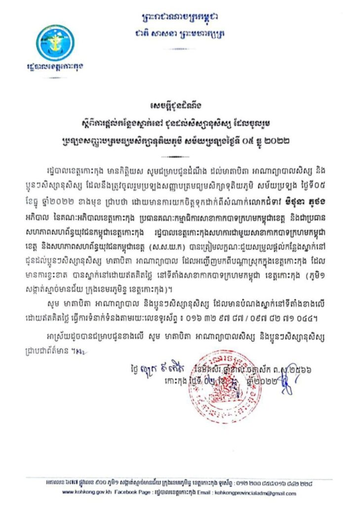 សេចក្តីជូនដំណឹង ស្តីពីការផ្តល់កន្លែងស្នាក់នៅ ជូនដល់សិស្សានុសិស្ស ដែលចូលរួមប្រឡងសញ្ញាបត្រមធ្យមសិក្សាទុតិយភូមិ សម័យប្រឡងថ្ងៃទី០៥ ខែធ្នូ ២០២២