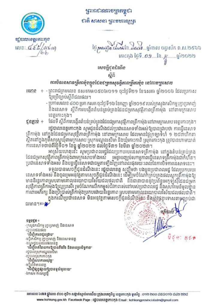 សេចក្តីជូនដំណឹង ស្តីពីការបិទនេសាទត្រីកាម៉ុងក្នុងដែនជម្រកសុវត្ថិភាពត្រីកាម៉ុង នៅពាមក្រសោប