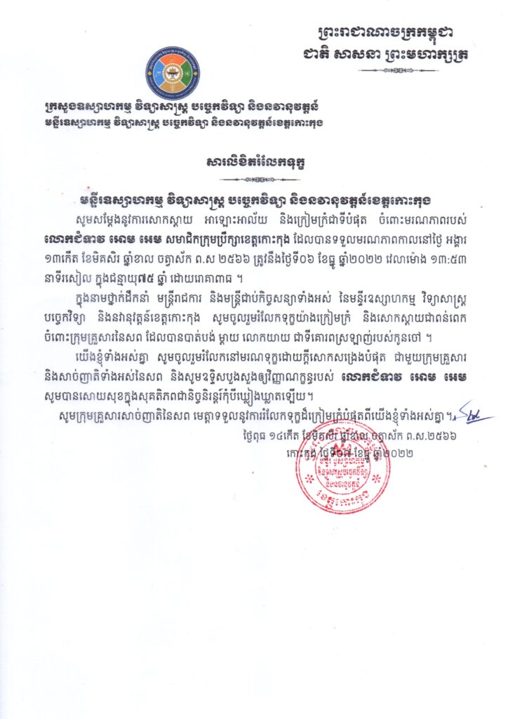 ក្នុងនាមថ្នាក់ដឹកនាំ មន្ត្រីរាជការ និងមន្ត្រីជាប់កិច្ចសន្យាទាំងអស់ នៃមន្ទីរឧស្សាហកម្ម វិទ្យាសាស្ត បច្ចេកវិទ្យា និងនវានុវត្តន៍ខេត្តកោះកុង សូមចូលរួមរំលែកទុក្ខយ៉ាងក្រៀមក្រំ និងសោកស្ដាយជាពន់ពេក ចំពោះក្រុមគ្រួសារនៃសពលោកជំទាវ អោម អេម ដែលបានបាត់បង់ ម្តាយ លោកយាយ ជាទីគោរពស្រឡាញ់របស់កូនចៅ ។