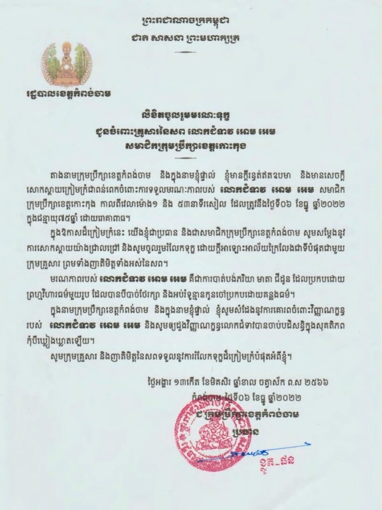 ក្រុមប្រឹក្សាខេត្តកំពង់ចាម ផ្ញើសារលិខិតរំលែកមរណទុក្ខជូនចំពោះក្រុមគ្រួសារ នៃសព លោកជំទាវ អោម អេម សមាជិកក្រុមបឹក្សាខេត្តកោះកុង អាណត្តិទី៣។