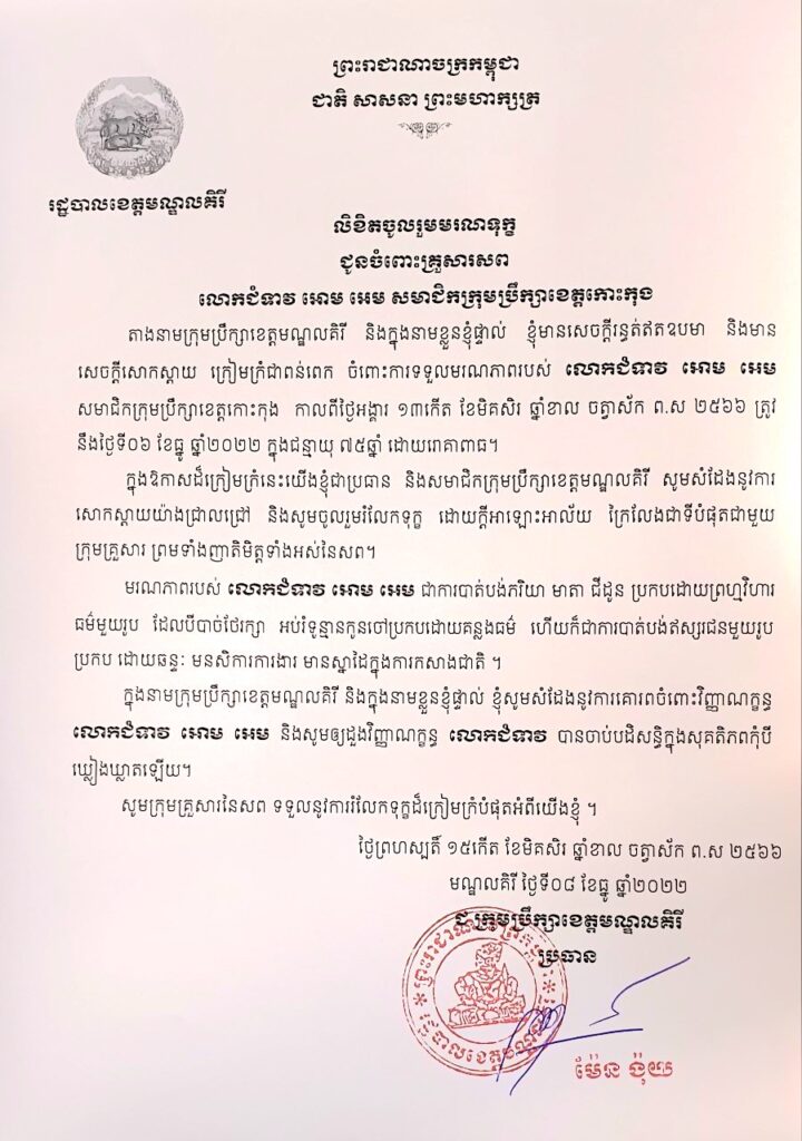 ក្រុមប្រឹក្សាខេត្តមណ្ឌលគិរី ផ្ញើសារលិខិតរំលែកមរណទុក្ខជូនចំពោះក្រុមគ្រួសារ នៃសព លោកជំទាវ អោម អេម សមាជិកាក្រុមបឹក្សាខេត្តកោះកុង អាណត្តិទី៣។