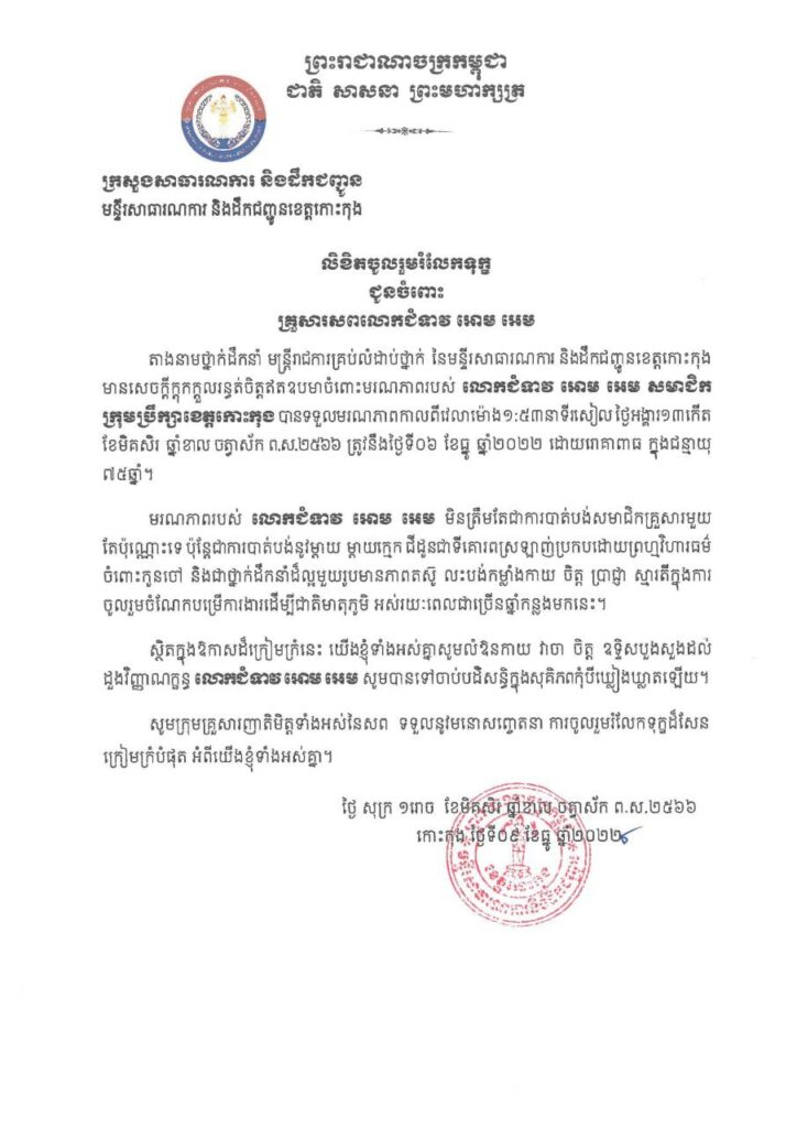 មន្ទីរសាធារណការ និងដឹកជញ្ជូនខេត្តកោះកុង ផ្ញើសារលិខិតរំលែកមរណទុក្ខជូនចំពោះក្រុមគ្រួសារ នៃសព លោកជំទាវ អោម អេម សមាជិកក្រុមបឹក្សាខេត្តកោះកុង អាណត្តិទី៣