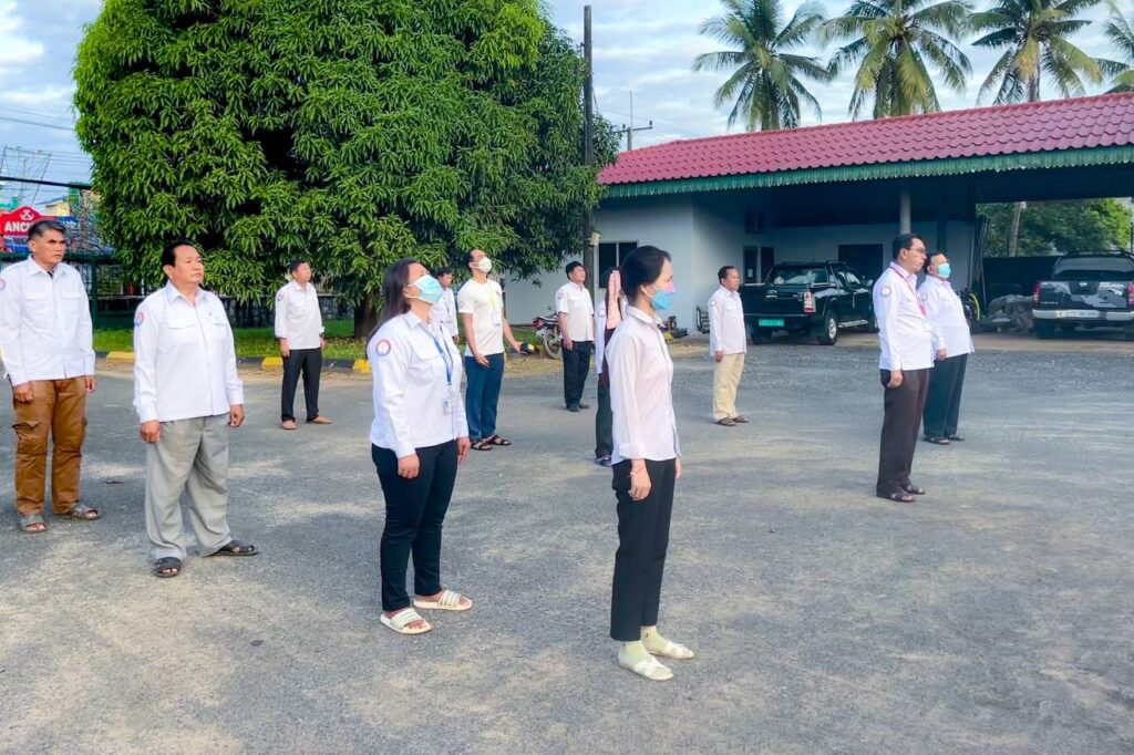 នៅបរិវេណដងទង់ជាតិមន្ទីរសាធារណការ និងដឹកជញ្ជូនខេត្តកោះកុង លោក ផាត់ សេង អនុប្រធានមន្ទីរ បានដឹកនាំមន្ត្រីរាជការគោរពទង់ជាតិ និងភ្លេងជាតិ នៃព្រះរាជាណាចក្រកម្ពុជា ព្រឹកថ្ងៃចន្ទ ៤រោច ខែមិគសិរ ឆ្នាំខាល ចត្វាស័ក ពុទ្ធសករាជ ២៥៦៦ ត្រូវនឹងថ្ងៃទី១២ ខែធ្នូ ឆ្នាំ២០២២