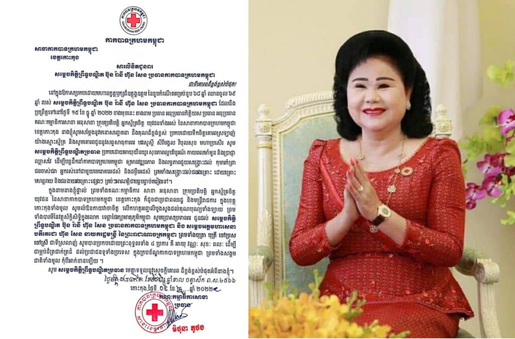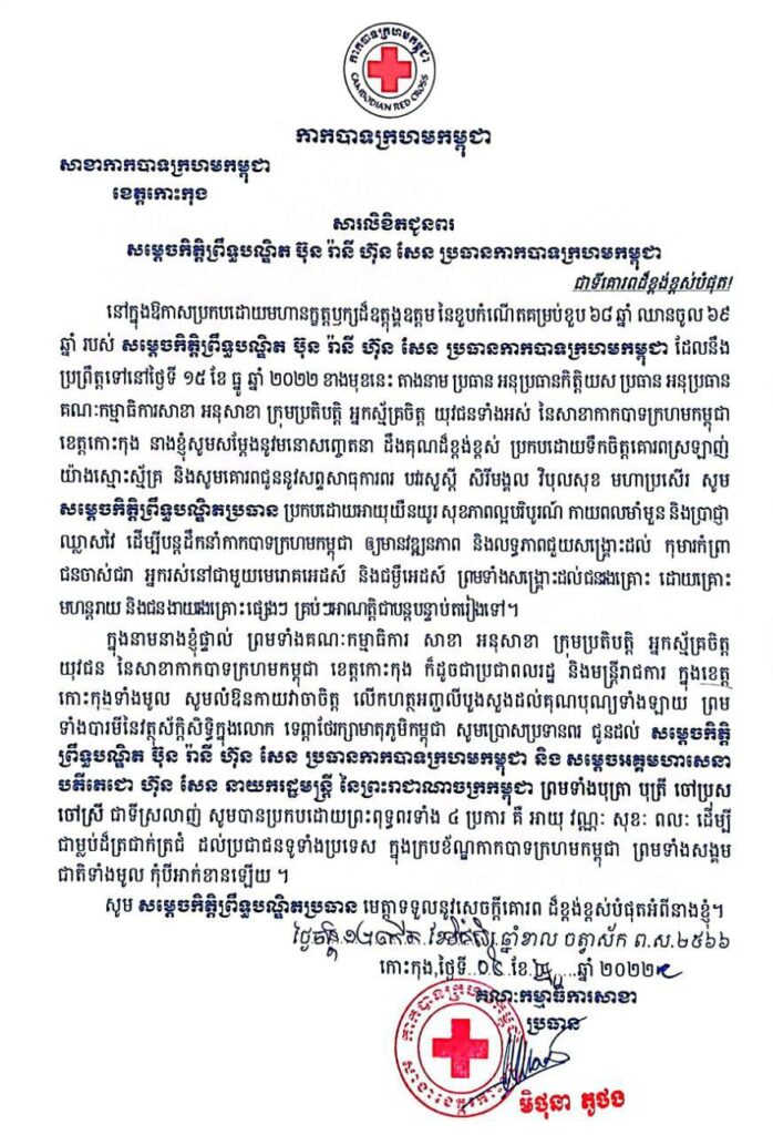 ក្នុងឱកាសដ៏នក្ខត្តឫក្សចម្រើនជន្មាយុ របស់ សម្តេចកិត្តិព្រឹទ្ធបណ្ឌិត ប៊ុន រ៉ានី ហ៊ុនសែន ប្រធានកាកបាទក្រហមកម្ពុជា ដែលនឹងឈានមកដល់នា ថ្ងៃទី១៥ ខែធ្នូ ឆ្នាំ២០២២ ខាងមុខនេះ យើងខ្ញុំទាំងអស់គ្នាជាគណៈកិត្តិយសសាខា គណៈកម្មាធិការសាខា មន្ត្រីក្រុមប្រតិបត្តិសាខា អនុសាខាក្រុង-ស្រុក ទាំង៧ អ្នកស្ម័គ្រចិត្ត ទីប្រឹក្សាយុវជន និងយុវជន កក្រក នៃសាខាកាកបាទក្រហមកម្ពុជា ខេត្តកោះកុង សូមគោរពអនុញ្ញាតសំដែងនូវអំណរសាទរ និងការដឹងគុណយ៉ាងជ្រាលជ្រៅបំផុត ចំពោះបេសកកម្មដ៏ឧត្តុង្គឧត្តម ក្នុងបុព្វហេតុមនុស្សធម៌ដើម្បីជាតិ ប្រជាជន ជួយសម្រាលទុក្ខលំបាកដល់ប្រជាពលរដ្ឋដែលរងគ្រោះ និងងាយរងគ្រោះ រួមទាំងទុរគតជន ជនចាស់ជរាឥតទីពឹង កុមារកំព្រា ជនពិការ ស្រ្តីមានផ្ទៃពោះ និងអ្នកជំងឺអេដស៏ដោយគ្មានការរើសអើង។