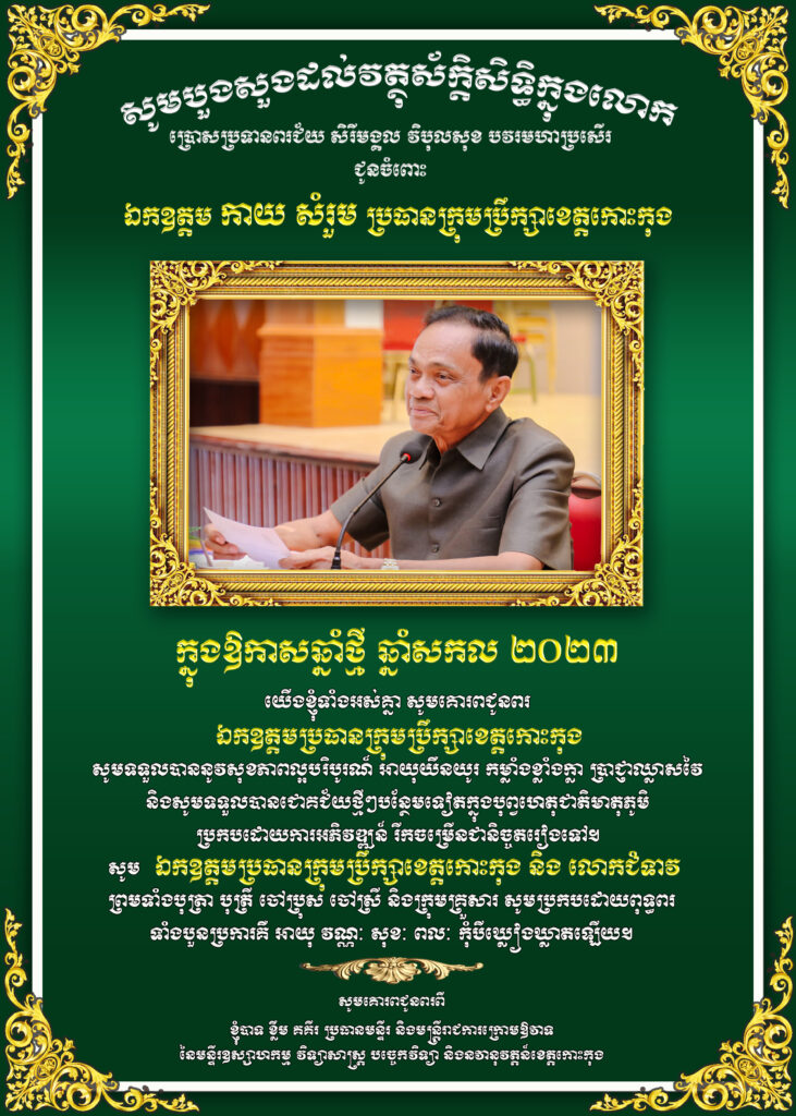 សូមគោរពជូនពរ ឯកឧត្តម កាយ សំរួម ប្រធានក្រុមប្រឹក្សាខេត្តកោះកុង និងលោកជំទាវ ព្រមទាំងបុត្រា បុត្រី ចៅប្រុស ចៅស្រី សូមប្រកបដោយសុខភាពល្អបរិបូណ៍ កំម្លាំងពលំមាំមួន ប្រាជ្ញាឈ្លាសវៃ ជន្មាយុយឺនយូរ និងជួបប្រទះនូវពុទ្ធពរទាំងបួនប្រការគឺ