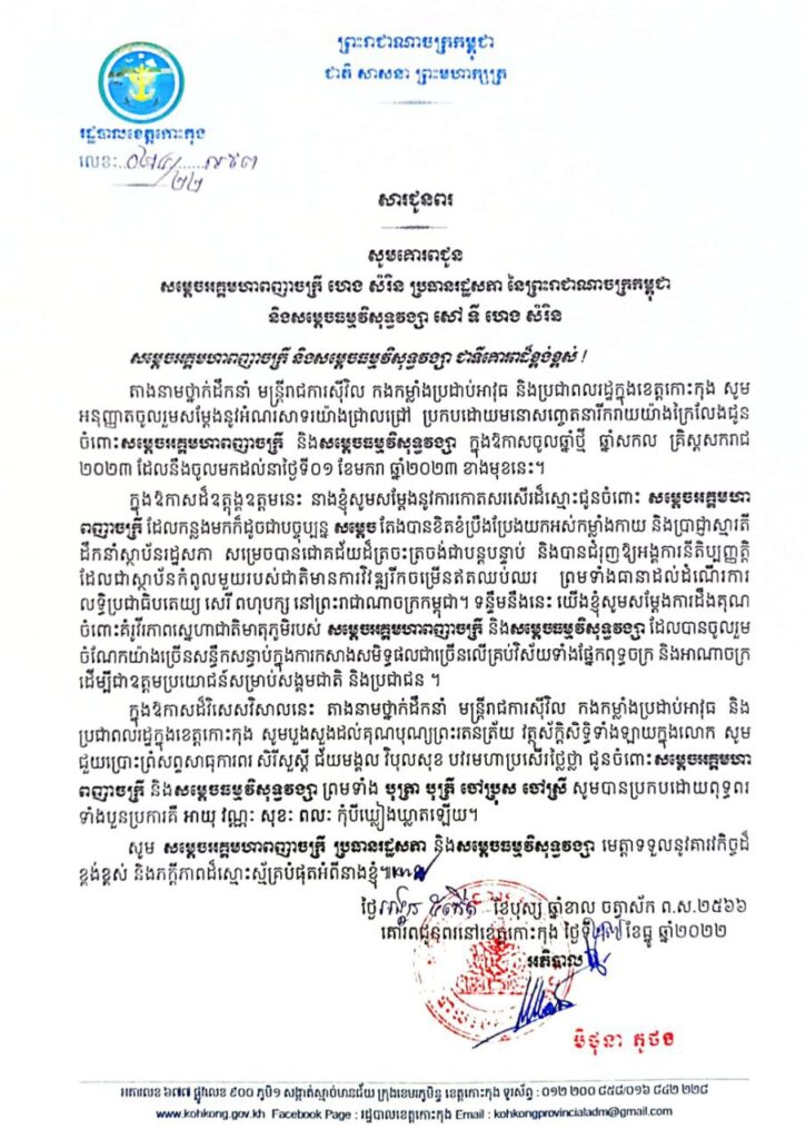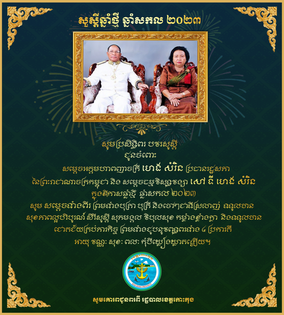 សារជូនពរ សូមគោរពជូន សម្ដេចអគ្គមហាពញាចក្រី ហេង សំរិន ប្រធានរដ្ឋសភា នៃព្រះរាជាណាចក្រកម្ពុជា និងសម្តេចធម្មវិសុទ្ធវង្សា សៅ ទី ហេង សំរិន ក្នុងឱកាសបុណ្យចូលឆ្នាំថ្មី ឆ្នាំសកល២០២៣ សូមគោរពជូនពរពី រដ្ឋបាលខេត្តកោះកុង