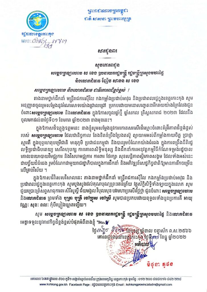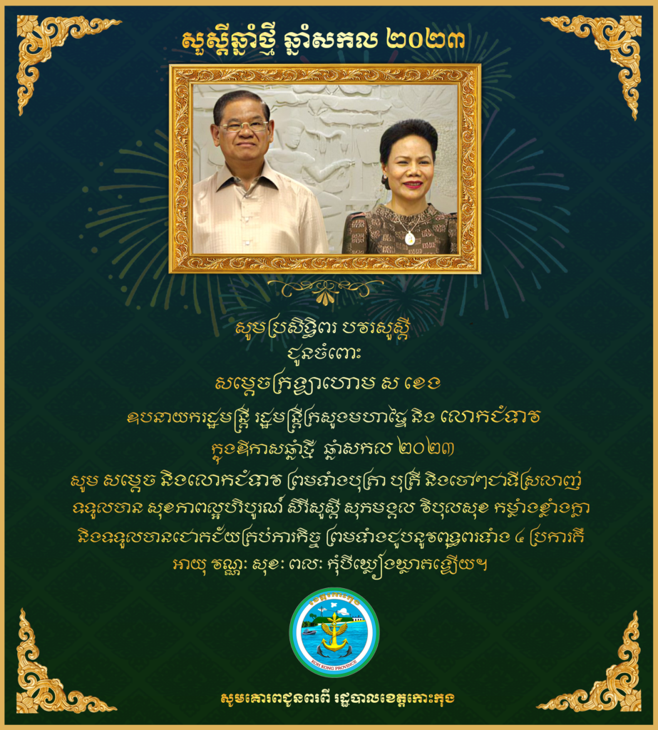 សារជូនពរ សូមគោរពជូន សម្តេចក្រឡាហោម ស ខេង ឧបនាយករដ្ឋមន្ត្រី រដ្ឋមន្ត្រីក្រសួងមហាផ្ទៃ នៃព្រះរាជាណាចក្រកម្ពុជា និងលោកជំទាវ ញ៉ែម សាខន ស ខេង ក្នុងឱកាសបុណ្យចូលឆ្នាំថ្មី ឆ្នាំសកល២០២៣ សូមគោរពជូនពរពី រដ្ឋបាលខេត្តកោះកុង