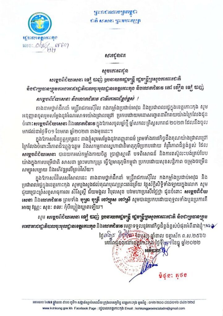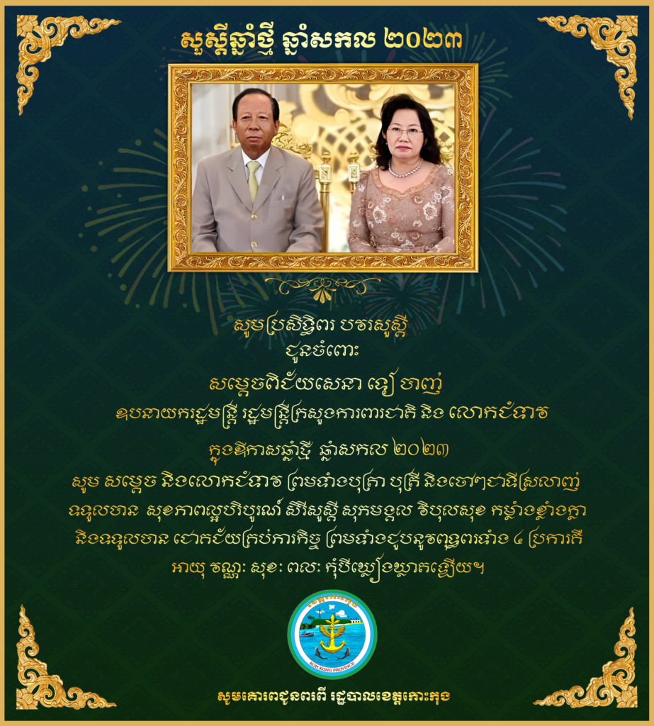 សារជូនពរ សូមគោរពជូន សម្តេចពិជ័យសេនា ទៀ បាញ់ ឧបនាយករដ្ឋមន្ត្រី រដ្ឋមន្ត្រីក្រសួងការពារជាតិ និងជាប្រធានក្រុមការងាររាជរដ្ឋាភិបាលចុះមូលដ្ឋានខេត្តកោះកុង និងលោកជំទាវ តៅ តឿន ទៀ បាញ់ ក្នុងឱកាសបុណ្យចូលឆ្នាំថ្មី ឆ្នាំសកល២០២៣ សូមគោរពជូនពរពី រដ្ឋបាលខេត្តកោះកុង