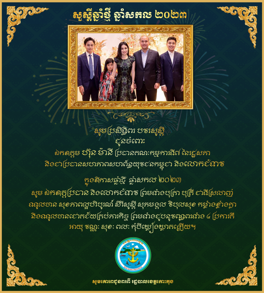 សារជូនពរ សូមគោរពជូន ឯកឧត្តម ហ៊ុន ម៉ានី ប្រធានគណៈកម្មការទី៧ នៃរដ្ឋសភា និងជាប្រធានសហភាពសហព័ន្ធយុវជនកម្ពុជា និងលោកជំទាវ ក្នុងឱកាសបុណ្យចូលឆ្នាំថ្មី ឆ្នាំសកល២០២៣ ។ សូមគោរពជូនពរពី រដ្ឋបាលខេត្តកោះកុង