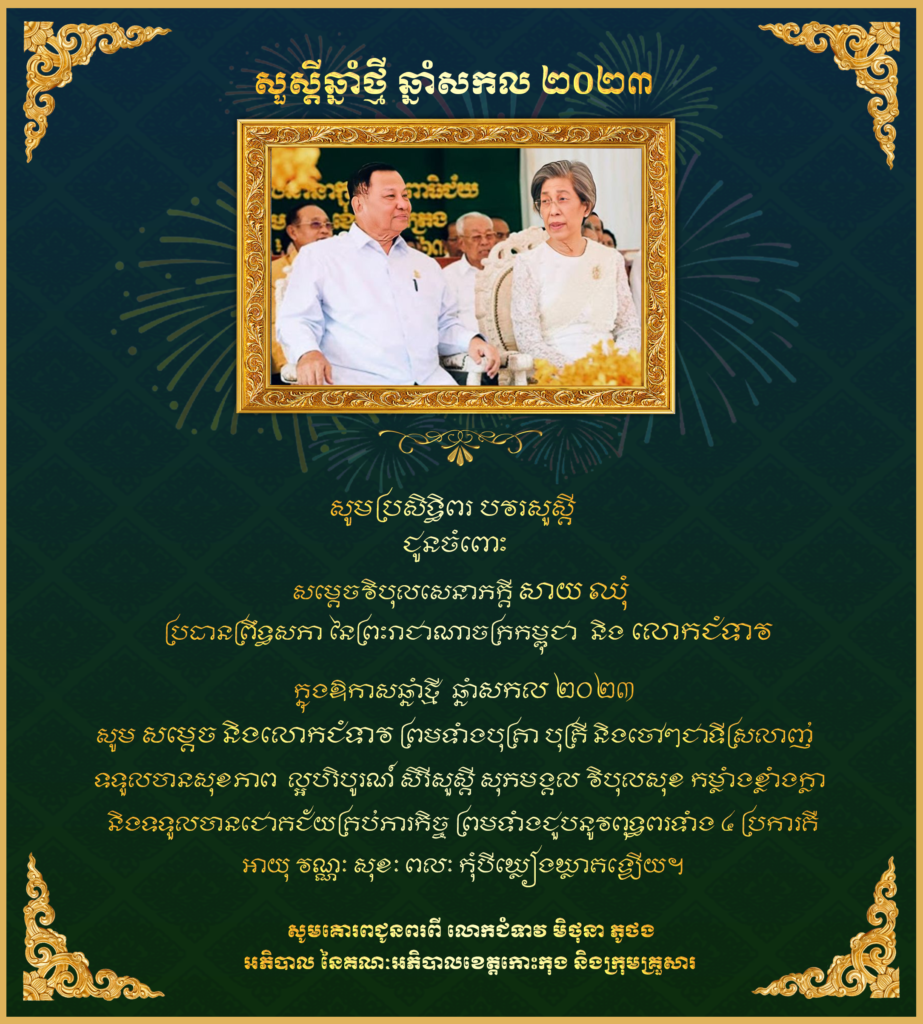 សារជូនពរ សូមគោរពជូន សម្តេចវិបុលសេនាភក្តី សាយ ឈុំ ប្រធានព្រឹទ្ធសភា នៃព្រះរាជាណាចក្រកម្ពុជា និងលោកជំទាវ ក្នុងឱកាសបុណ្យចូលឆ្នាំថ្មី ឆ្នាំសកល២០២៣ ។ សូមគោរពជូនពរពី លោកជំទាវ មិថុនា ភូថង អភិបាល នៃគណៈអភិបាលខេត្តកោះកុង និងក្រុមគ្រួសារ