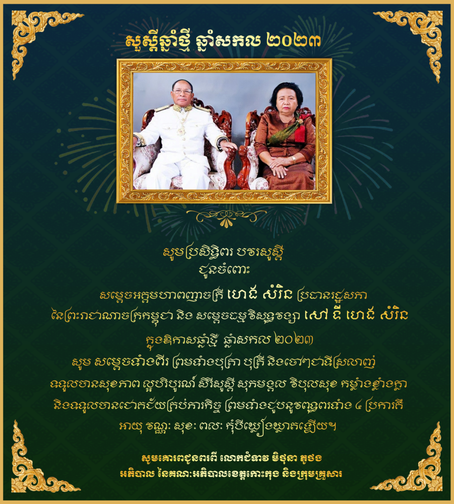 សារជូនពរ សូមគោរពជូន សម្ដេចអគ្គមហាពញាចក្រី ហេង សំរិន ប្រធានរដ្ឋសភា នៃព្រះរាជាណាចក្រកម្ពុជា និងសម្តេចធម្មវិសុទ្ធវង្សា សៅ ទី ហេង សំរិន ក្នុងឱកាសបុណ្យចូលឆ្នាំថ្មី ឆ្នាំសកល២០២៣ ។ សូមគោរពជូនពរពី លោកជំទាវ មិថុនា ភូថង អភិបាល នៃគណៈអភិបាលខេត្តកោះកុង និងក្រុមគ្រួសារ