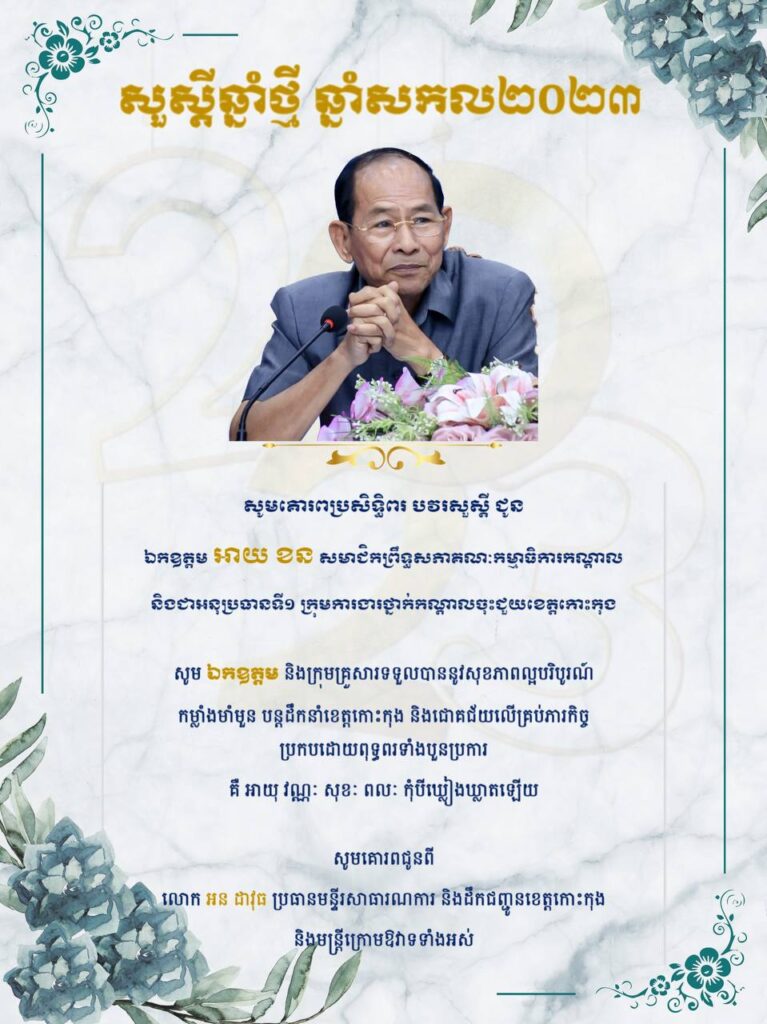 សារលិខិតជូនពរ គោរពជូន ឯកឧត្តម អាយ ខន សមាជិកព្រឹទ្ធសភាគណៈកម្មាធិការកណ្តាល និងជាអនុប្រធានទី១ ក្រុមការងារថ្នាក់កណ្តាលចុះជួយខេត្តកោះកុង ក្នុងឱកាសចូលឆ្នាំថ្មី ឆ្នាំសកល ២០២៣