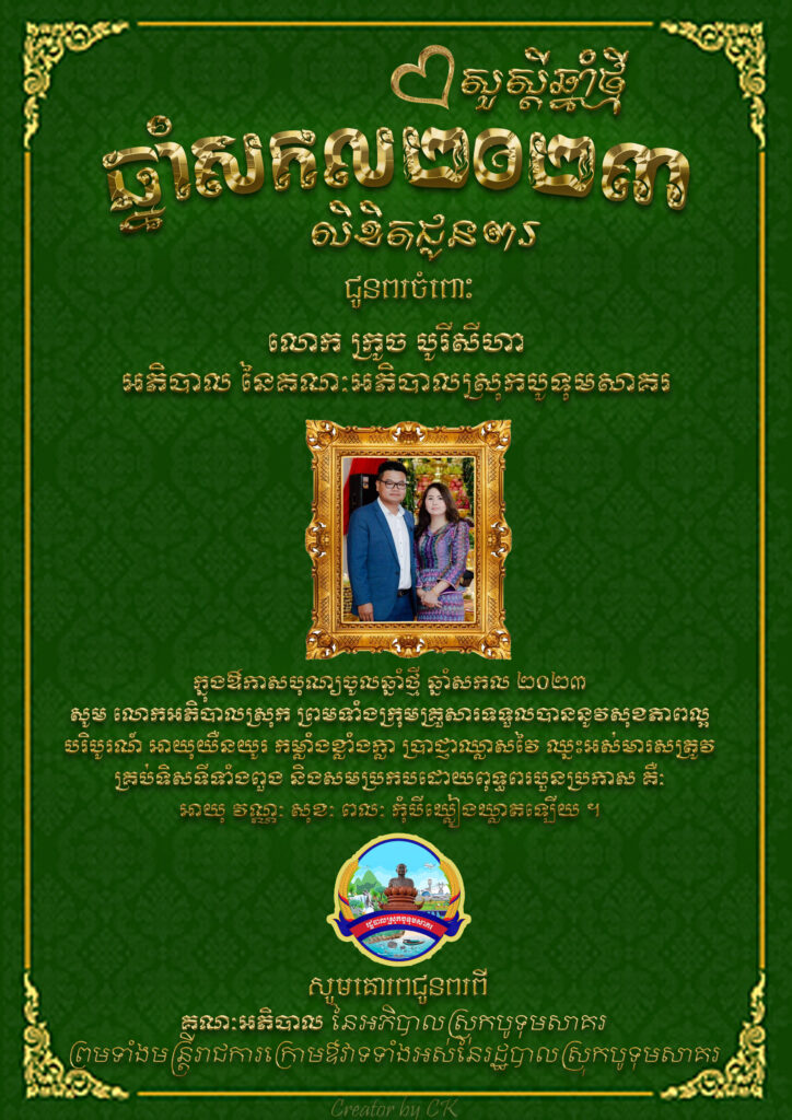 រដ្ឋបាលស្រុកបូទុមសាគរ សូមគោរពជូនពរចំពោះ លោក ក្រូច បូរីសីហា អភិបាល នៃគណៈអភិបាលស្រុកបូទុមសាគរ ក្នុងឱកាសចូលឆ្នាំថ្មី ឆ្នាំសកល ២០២៣ ។