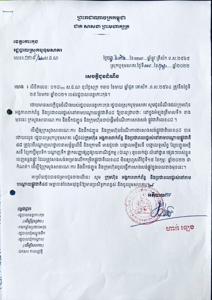 សេចក្តីជូនដំណឹង រដ្ឋបាលស្រុកបូទុមសាគរ មានកិត្តិយស សូមជម្រាបជូនដំណឹងដល់ដល់ក្រុមហ៊ុន អង្គភាពពាក់ព័ន្ធ បងប្អូនប្រជាពលរដ្ឋរស់នៅតាមបណ្ដោលផ្លូវជាតិ៤៨ និងសូមគោរពឯកឧត្តមប្រធាន និងក្រុមការងាររុះរើជាទីគោរពក្រុមហ៊ុនសាងសង់សូមជូនដំណឹងអំពីការបំផ្ទុះសាកល្បងនៅចំណុចគីឡូម៉ែត្រ ៥៩+៨០០ នាថ្ងៃសុក្រ ទី១៣ ខែមករា ឆ្នាំ២០២៣។អាស្រ័យដូចបានជម្រាបជូនខាងលើសូមបណ្តាភាគីពាក់ព័ន្ធមេត្តាជ្រាប។ បន្ថែមពីនេះសូមក្រុមការងារមិត្តហ្វូនមេត្តាជួយធ្វើការរុះរើខ្សែបណ្តាញរបស់ខ្លួនចេញផុតពីទីតាំងការងាររបស់ក្រុមហ៊ុនសាងសង់ផង ប្រសិនបើមានករណីខូចខាតឬដាច់ខ្សែទាំងនោះក្រុមហ៊ុនសាងសង់មិនទទួលខុសត្រូវឡើយ។