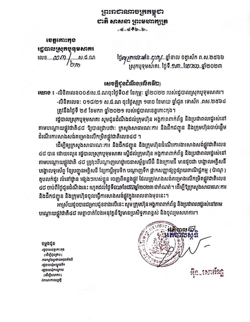 សេចក្តីជូនដំណឹងលេខ០០៣/២៣ រដ្ឋបាលស្រុកបូទុមសាគរ ជាលើកទី២ ចុះថ្ងៃទី១៣ ខែមករា ឆ្នាំ២០២៣ មានកិត្តិយសសូមជម្រាបជូនដំណឹងដល់ដល់ក្រុមហ៊ុន អង្គភាពពាក់ព័ន្ធ បងប្អូនប្រជាពលរដ្ឋរស់នៅតាមបណ្ដោលផ្លូវជាតិ៤៨ ក្រសួងសាធារណៈការ និងដឹកជញ្ជូន និងក្រុមហ៊ុនចាប់ផ្ដើម ដំណើរការសាងសង់គម្រោងលើកម្រិតផ្លូវជាតិលេខ៤៨ ។