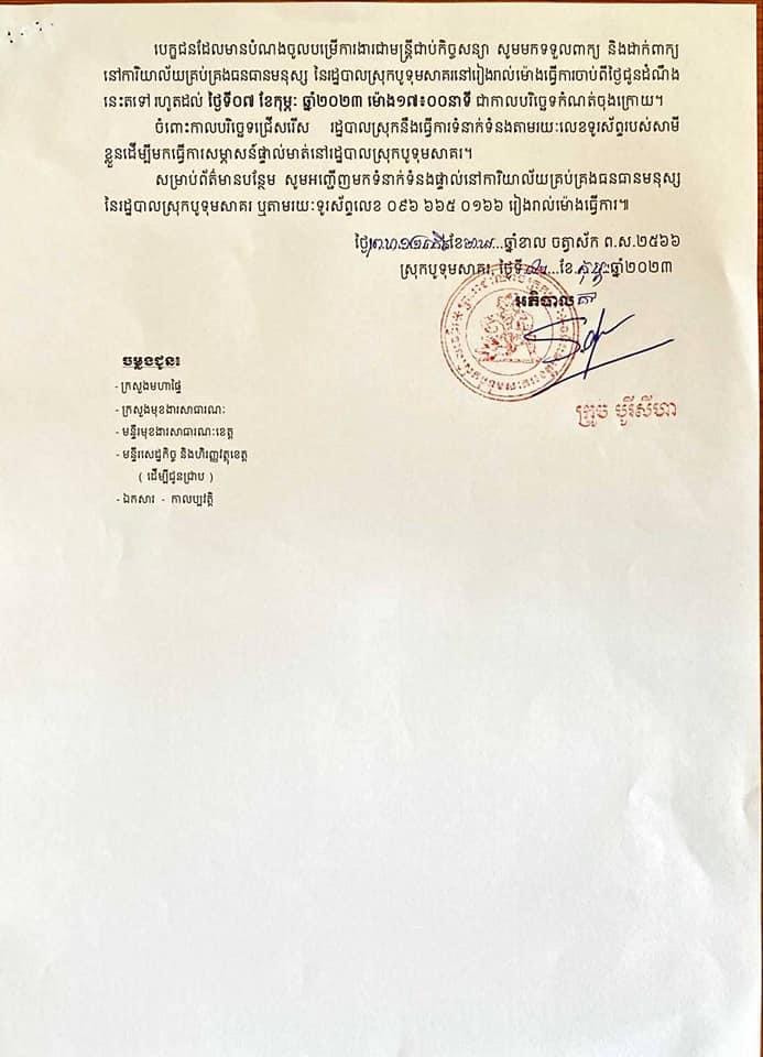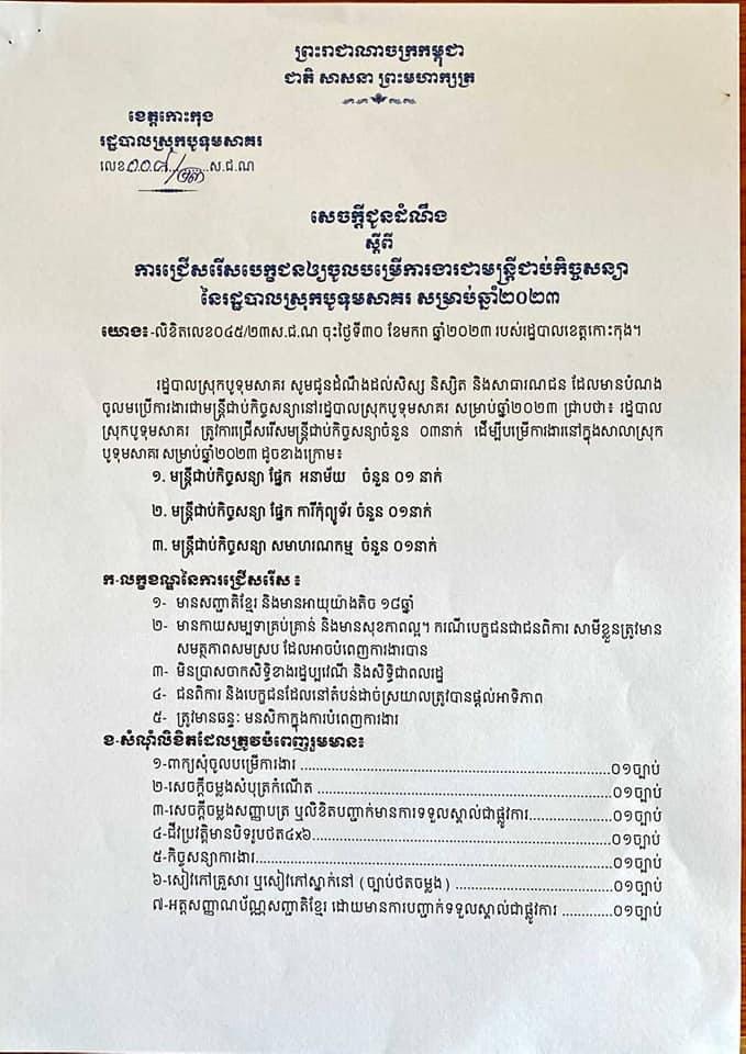 សេចក្តីជូនដំណឹងរបស់រដ្ឋបាលស្រុកបូទុមសាគរ លេខ០០៨/២៣ ស.ជ.ណ ចុះថ្ងៃទី០២ ខែកុម្ភៈ ឆ្នាំ២០២៣ ស្ដីពីការជ្រើសរើសបេក្ខជនឱ្យចូលបម្រើការងារជាមន្ត្រីកិច្ចសន្យា នៃរដ្ឋបាលស្រុកបូទុមសាគរសម្រាប់ឆ្នាំ២០២៣ ។